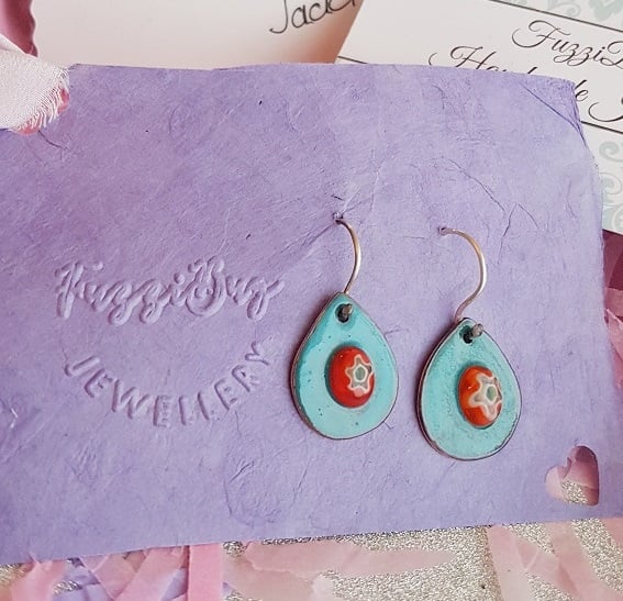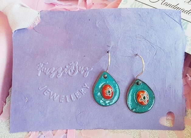 They are 15mm in size, hand cut, filed, then dusted with two layers of teal enamel, then a glass millefiori bead added and torch fired in between, then hand polished.