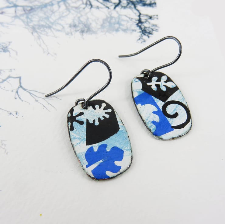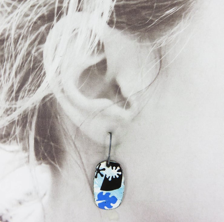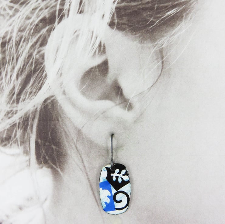 Rounded rectangle copper shapes have been painted with blue and white enamel. I cut out different decal shapes and arranged them on the surface of the enamel before a final firing. The backs and silver ear wires have been oxidised so appear black. 20mm x 14mm and 35mm from very top to bottom.