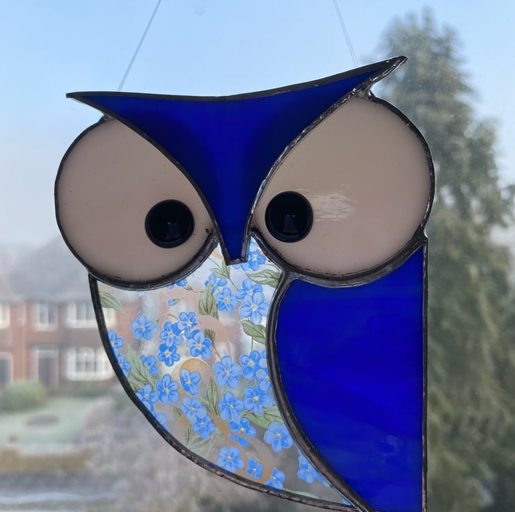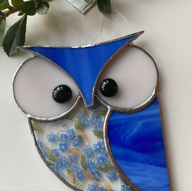 A beautiful stained glass owl made using the Tiffany ( copper foiled ) method of stained glass . It is made in a lovely blue opaque ,white opaque and clear blue forget me not flowery glass with 2 black glass nugget eyes.