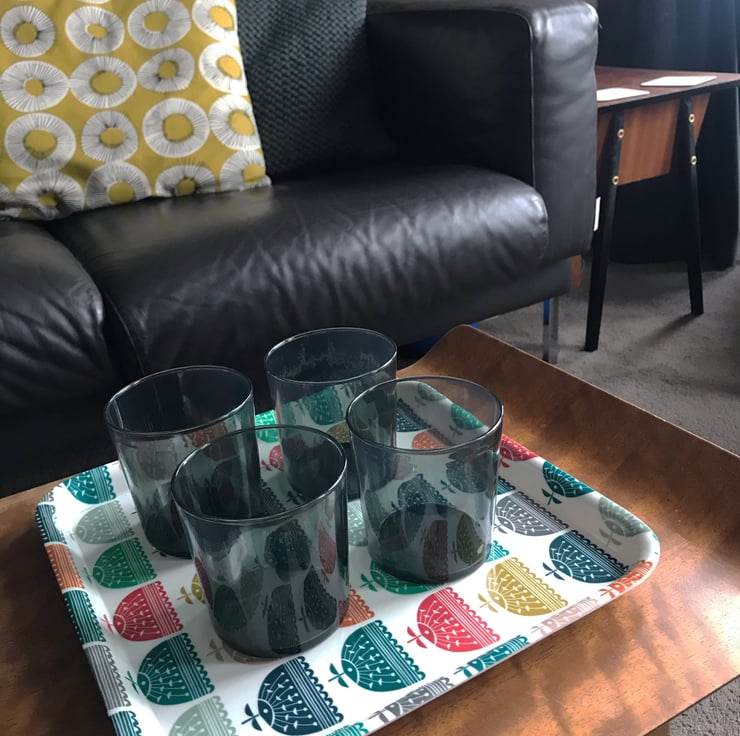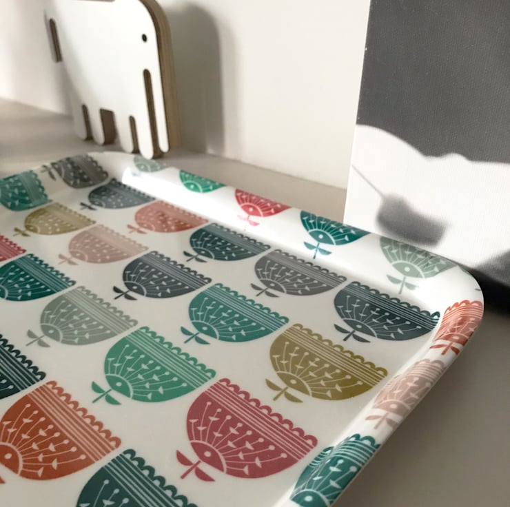 All my designs are created in my little studio by the sea starting life as a lino print and are then digitally coloured to enable me to create the amazing colour palette. My trays are then made by a small factory in the UK.