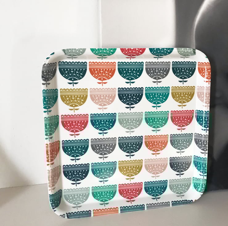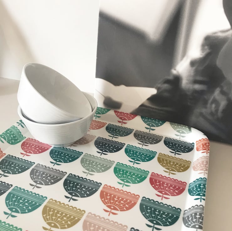 The tray is part of my 'Little Flowers' range which also includes a 'little flowers' teal, grey & yellow square tray, 'Little Rainbow Flowers' melamine coasters, 'Little Flowers' single colour melamine coasters & 100% cotton screenprinted 'Little Flowers' tea towels alongside A3 Giclee prints and cards. Check out my homeware, art prints & card sections of my shop to see the whole range.