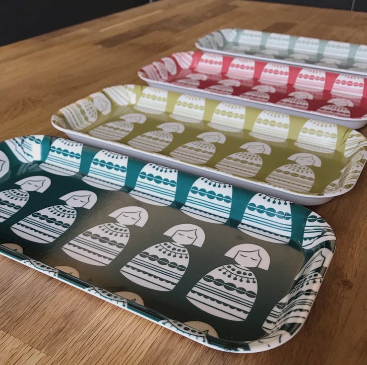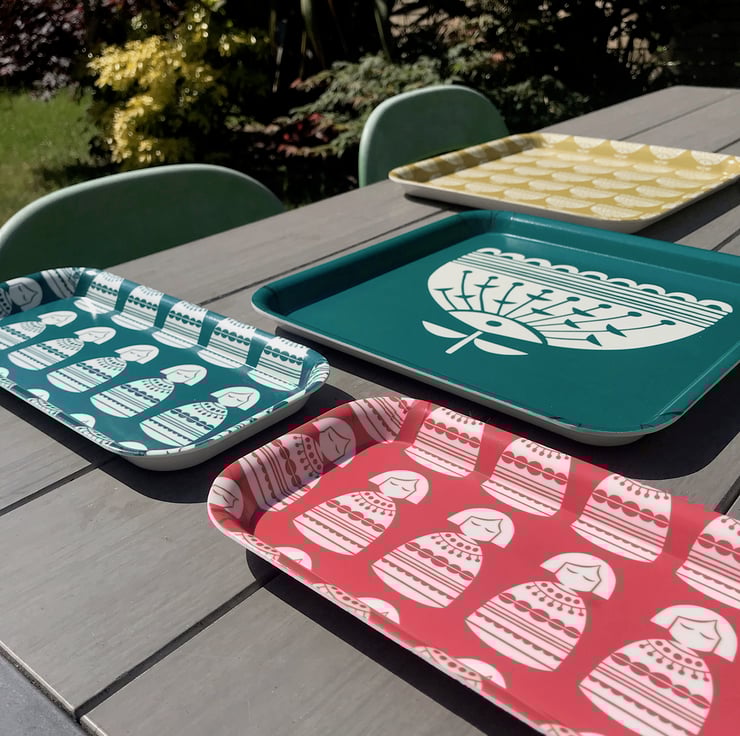 All my designs are created in my little studio by the sea starting life as a lino print and are then digitally coloured to enable me to create the amazing colour palette and patterns you see. My melamine trays are then printed by a small family run factory in the UK.