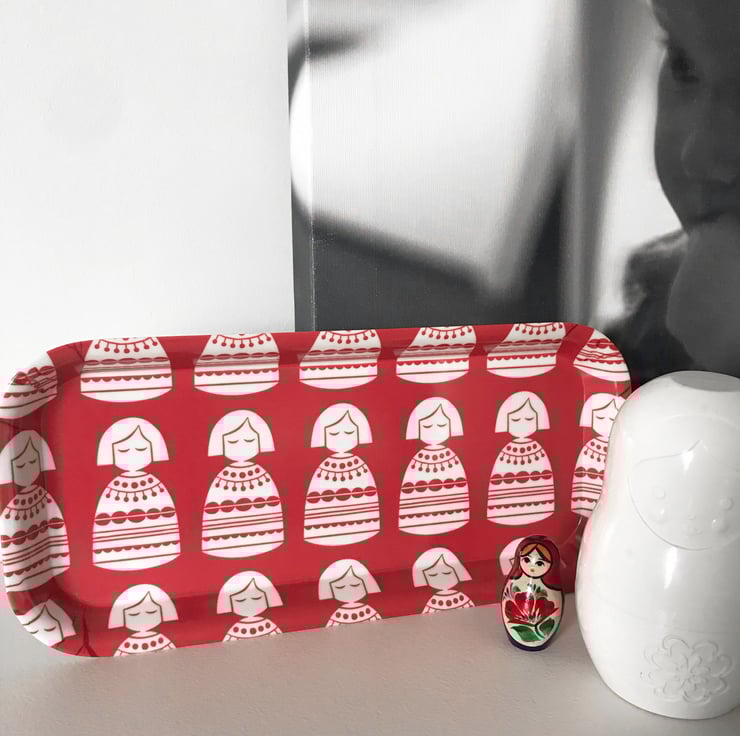 This beautiful 'Babushka' design with repeat pattern detail is a perfect addition to your kitchen. Printed in a soft red colourway with little Babushka repeating across the centre of the tray this tray makes a perfect addition to your entertaining range. They are perfect for snacks, dip, sushi and more and stack inside each other for easy storage. They can also be used elsewhere around the home for jewellery, keys, make up or anything else you want to capture.