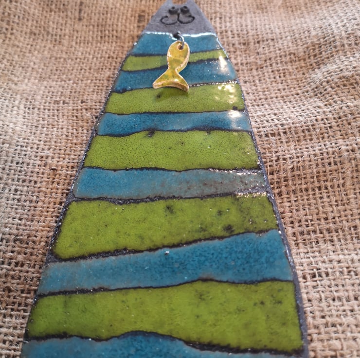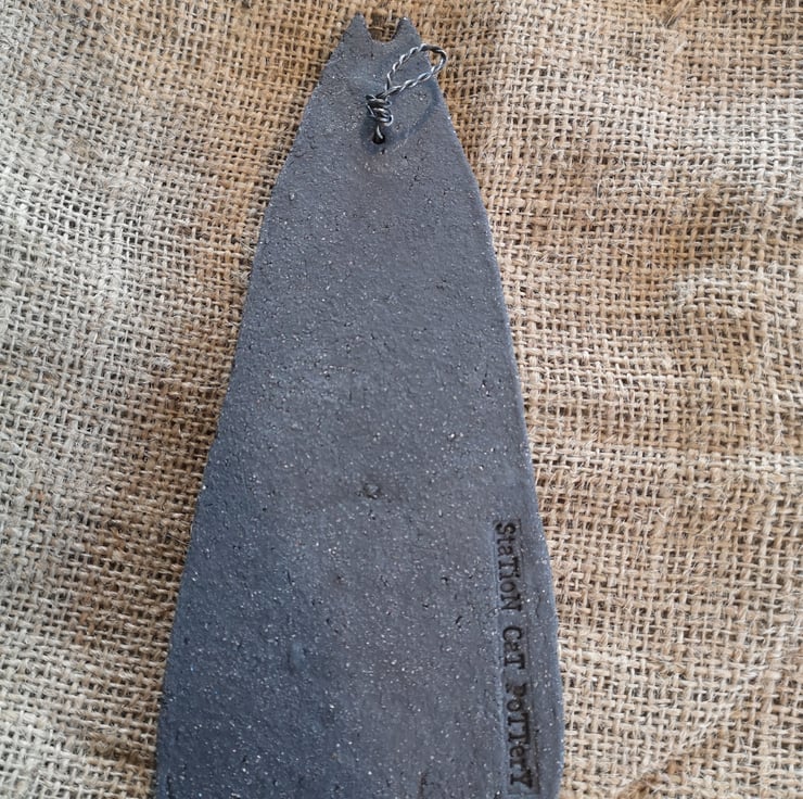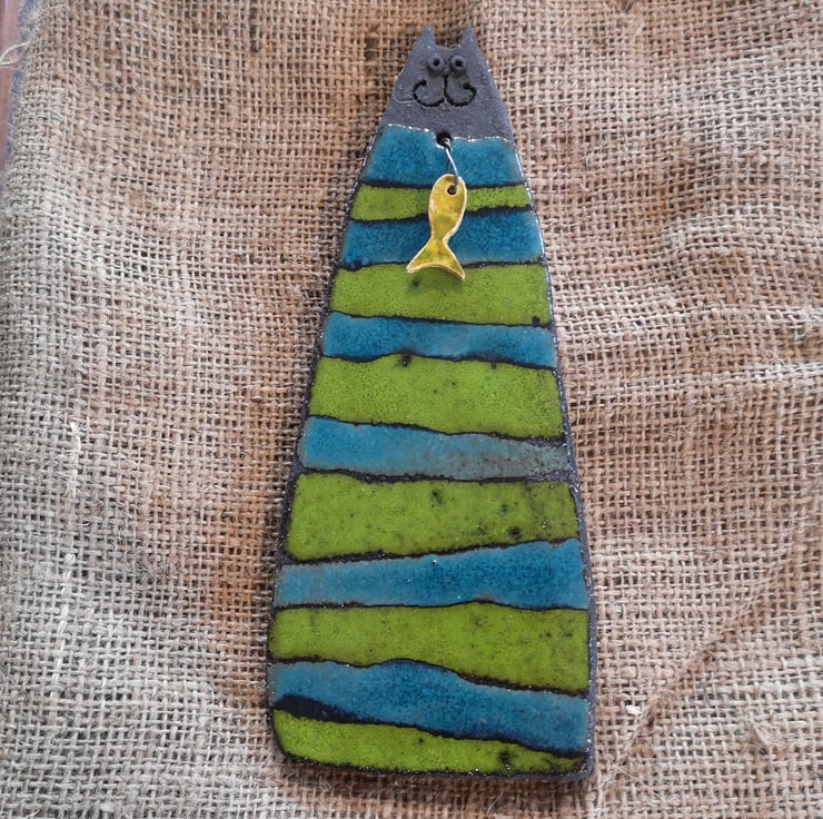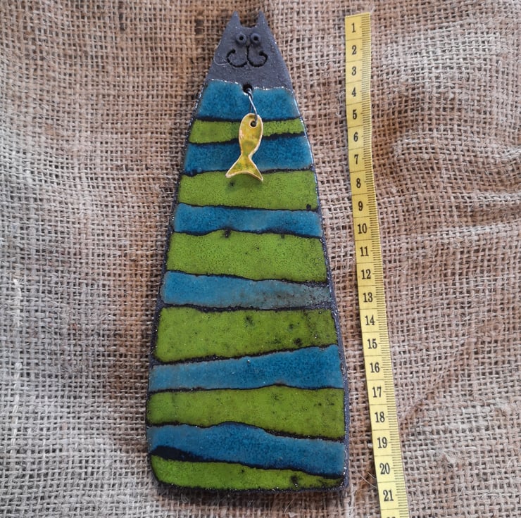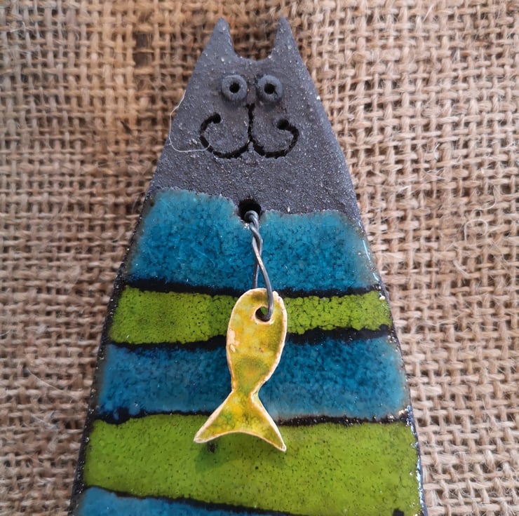 I then glaze each cat, and fire for a second time before attaching the Fish by wire, which creates a hook at the back of the cat for securely hanging on a wall or door.