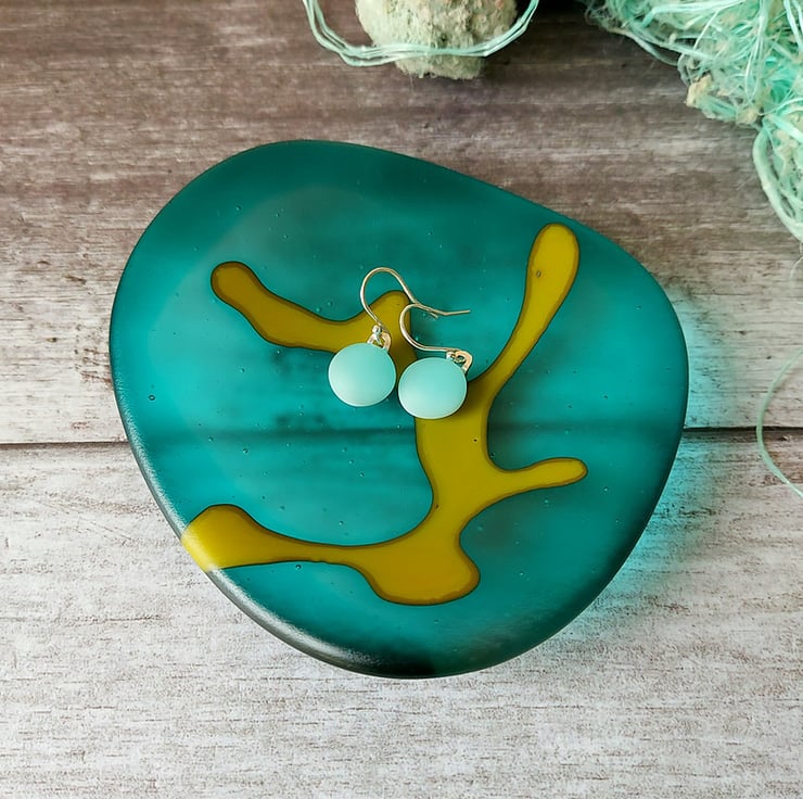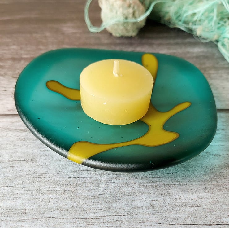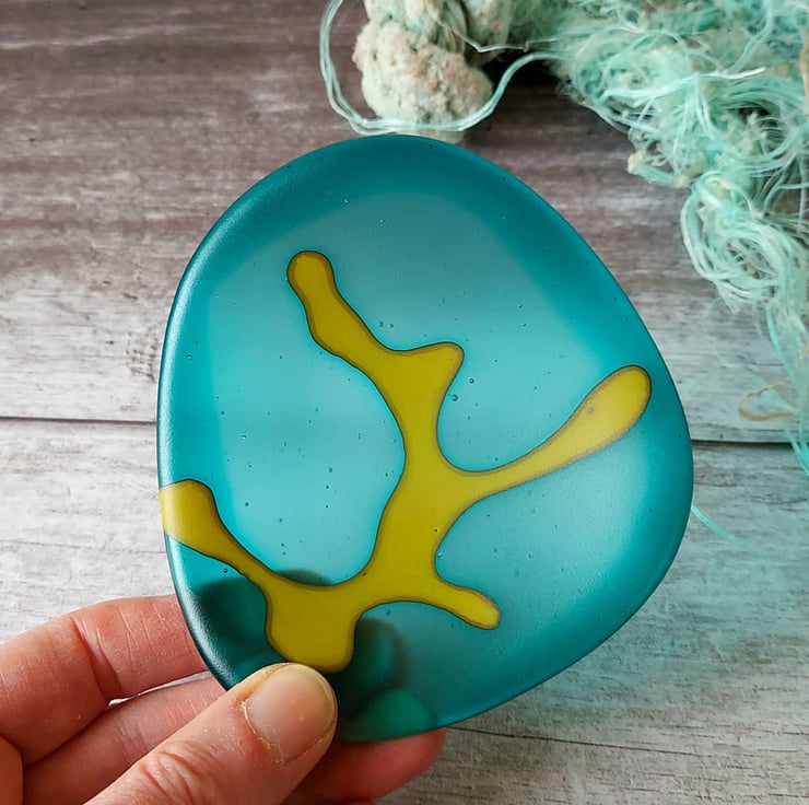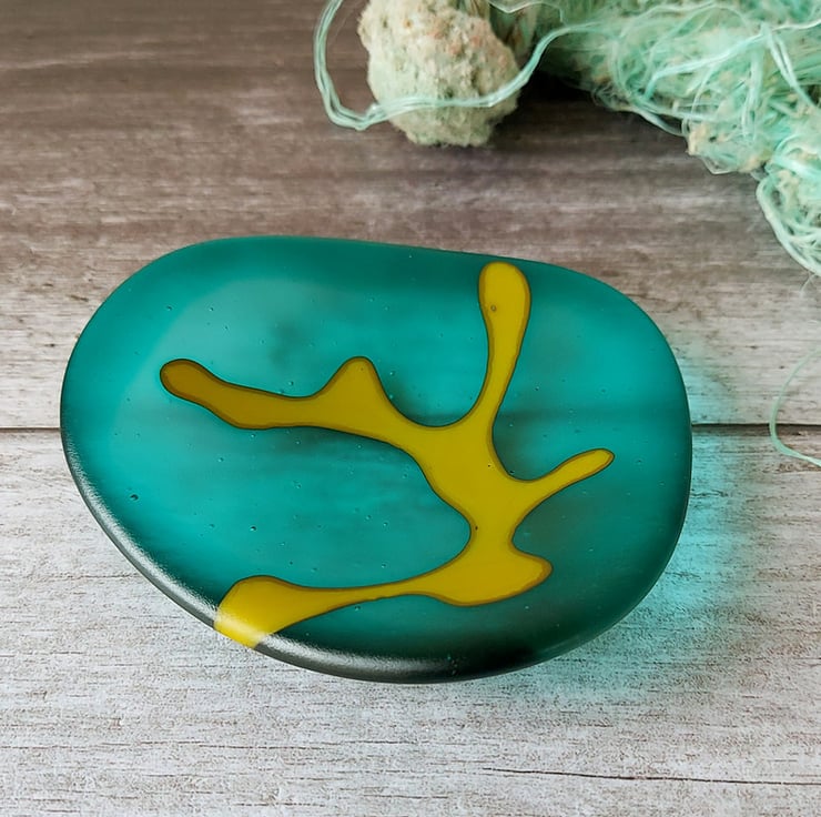 The shallow fused glass dish in rich teal coloured glass has a seaweed motif in yellow-green and a smooth satin finish, just like seaglass. The dish is a smooth rounded pebble shape and the glass is thick enough to feel satisfyingly weighty in your hand.