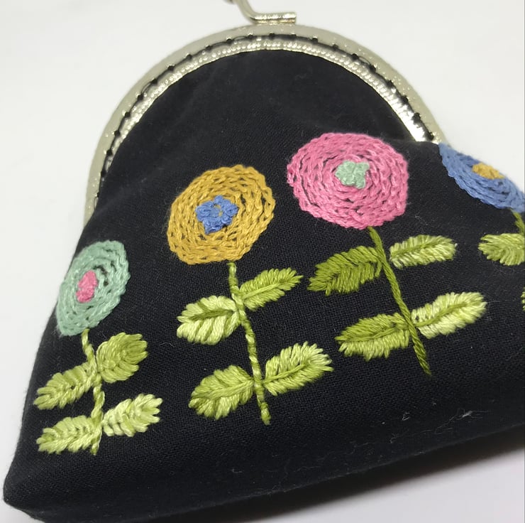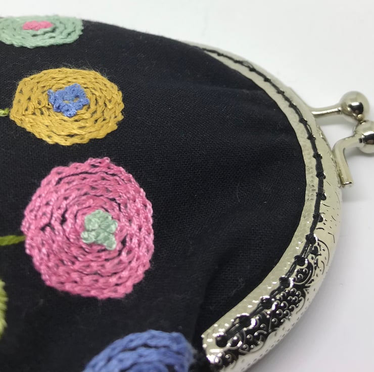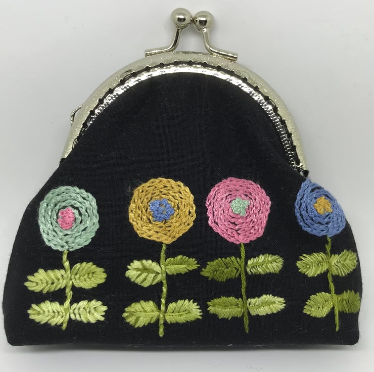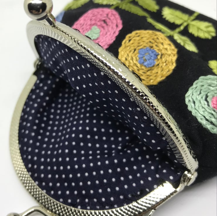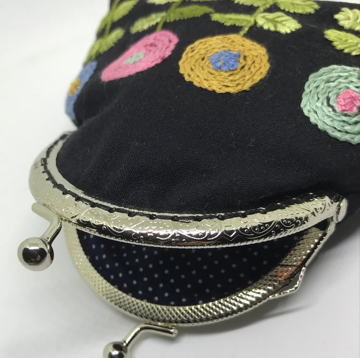 A lovely modern flower embroidery onto a Navy Blue Wool fabric makes up this small Coin clasp purse. Set in a Silver coloured clasp and sewn in using a matching Navy Blue thread. The Lining is a Navy Blue cotton with white spots. Measurements are 11cm high by 12cm wide at the widest. This is a very dark Navy blue and the coloured flowers really pop from the dark background.