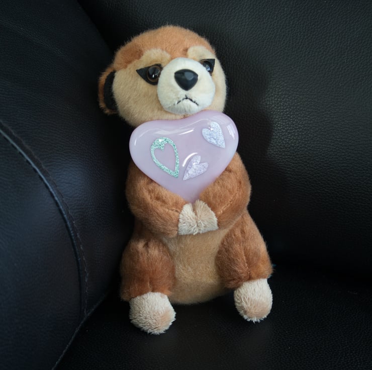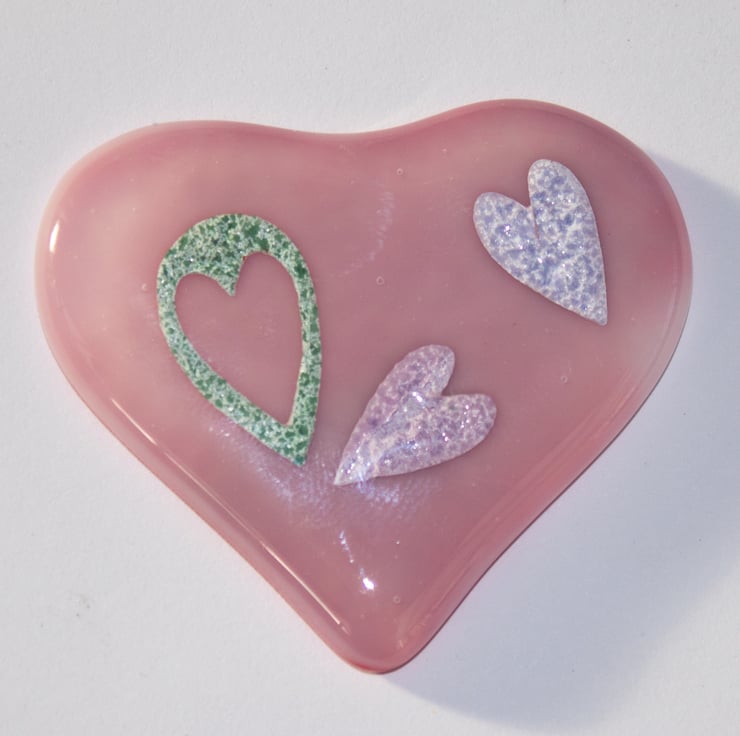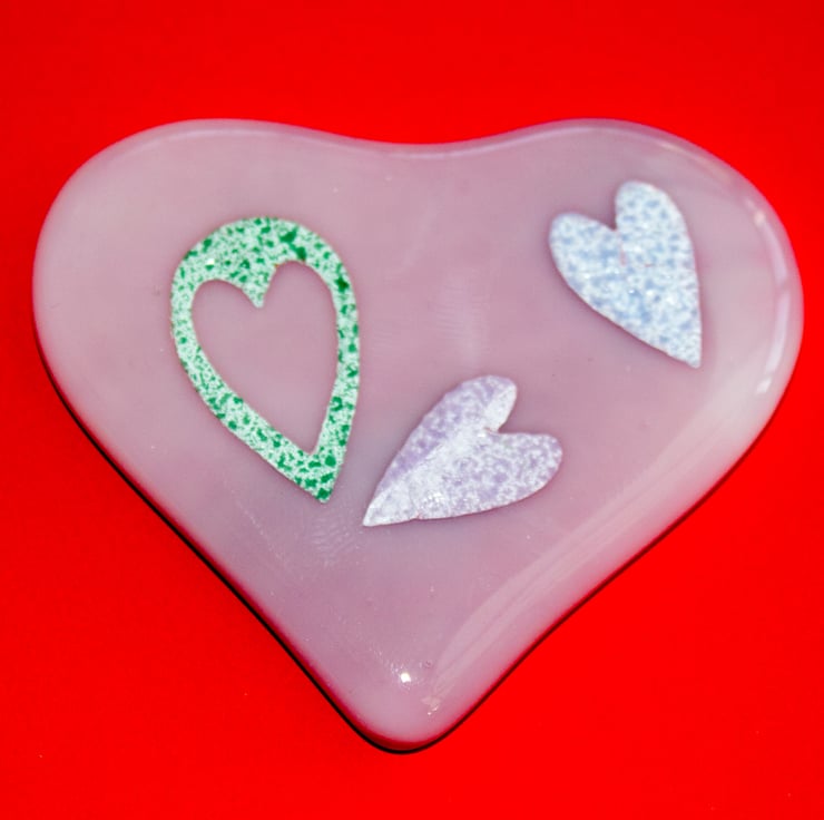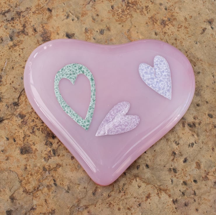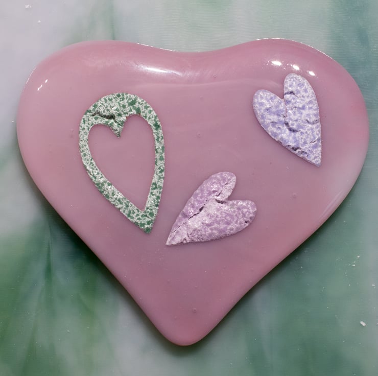 This Pale Pink Fused Glass Heart has three ceramic paper hearts embedded within it.