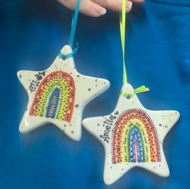 Personalised Ceramic Rainbow Star Hanger, Unique Christmas Hanging Decoration