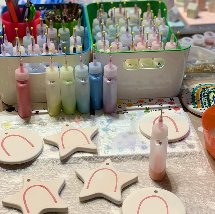 Each rainbow is hand painted on to a white earthenware star shaped hanger using underglaze paints. Black doodles and splatters are also hand painted making each hanger completely unique. Once painted the hangers are dipped in a glossy transparent glaze and kiln-fired. Once fired each hanger is individually strung together with a coordinated satin ribbon and bead and is ready to hang.