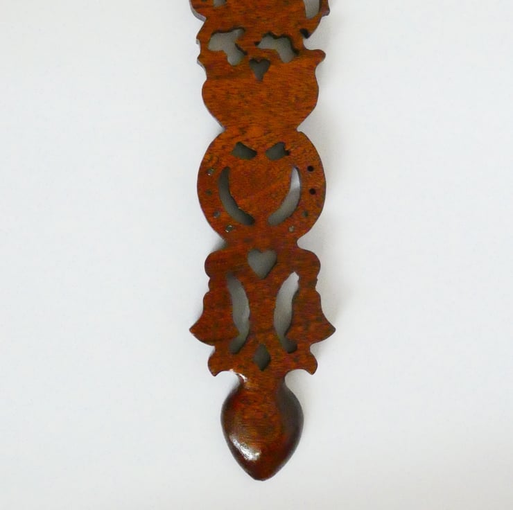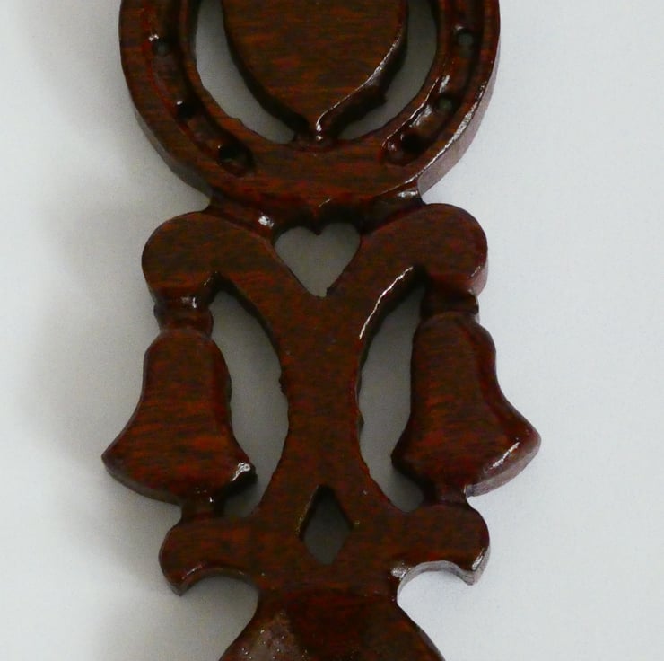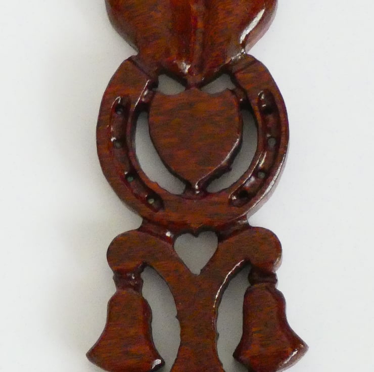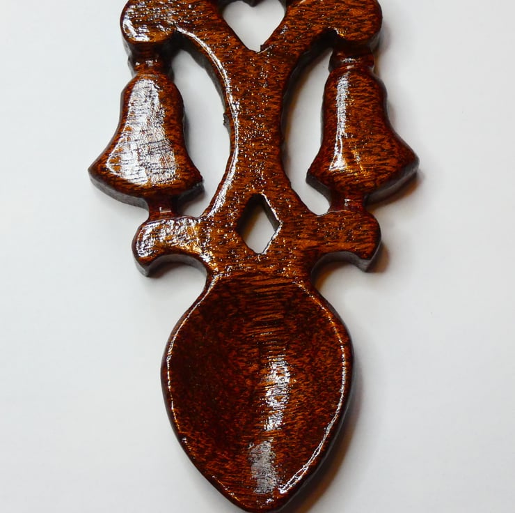A piece of sapele was selected and cut to accommodate the size of the love spoon. The love spoon was cut using a scrollsaw following a design. I then handcarved it to enhance the fine detail. Next I sanded it to a smooth finish and coated it with several coats of lacquer to protect it and highlight the beautiful grain of the wood. The lacquer used is water and heat resistant, and toy safe.