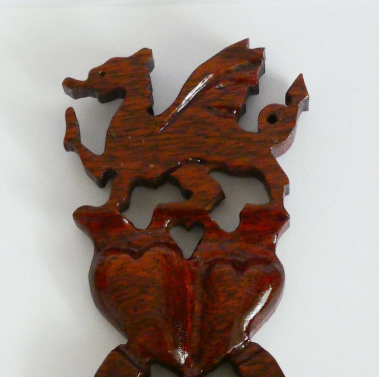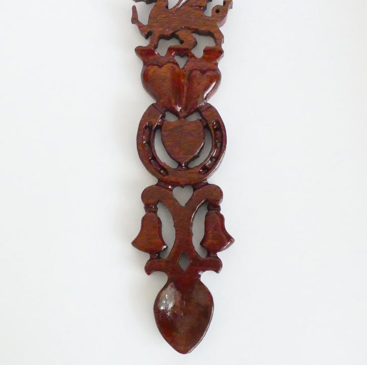 Unique Welsh Dragon Love Spoon made from a solid piece of Sapele Wood. This handcarved Lovespoon also contains hearts, a shield, a horse shoe, and two bells. It has been upcycled from reclaimed wood. A perfect present for an anniversary, birthday, wedding or engagement.