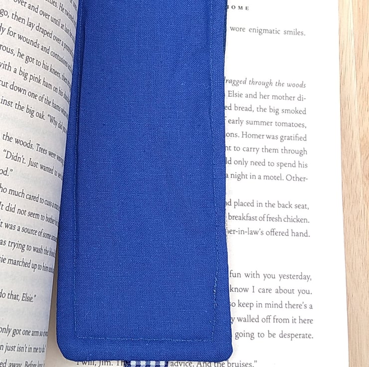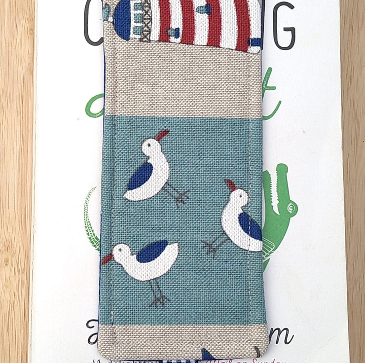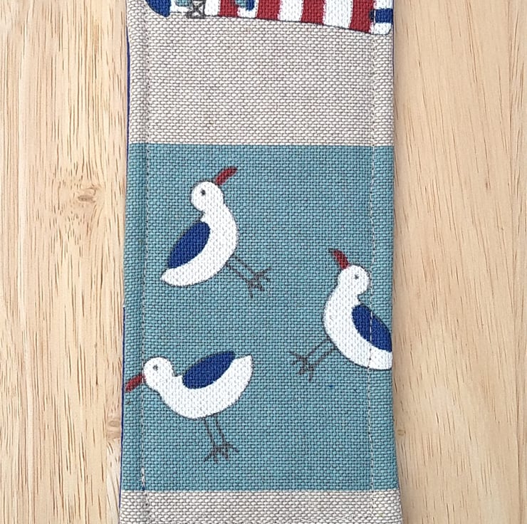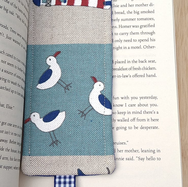 This is a handmade bookmark in a linen blend fabric featuring seagulls and a red striped lighthouse. It is padded with fusible fleece and the back has a contrasting royal blue cotton fabric. There's a checked gingham ribbon on the lower edge to ensure, that you can find it in your book. I have topstitched all around the edge of the bookmark.
