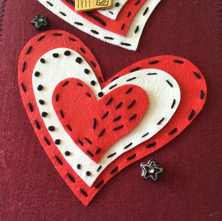 Die cut faux leather hearts in red and white have been hand stitched with a black embroidery thread onto a deep red fabric background.