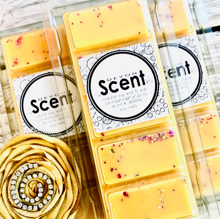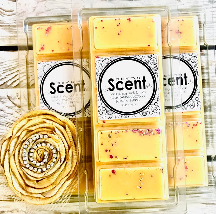 Our highly fragranced long lasting Sandalwood & Black Pepper Snap Bar Wax Melts have a comforting, warming aroma with top notes of honeysuckle and geranium, mid notes of black pepper, tonka bean and rosewood, finishing with base notes of creamy sandalwood, whitewoods, musk and vetiver.