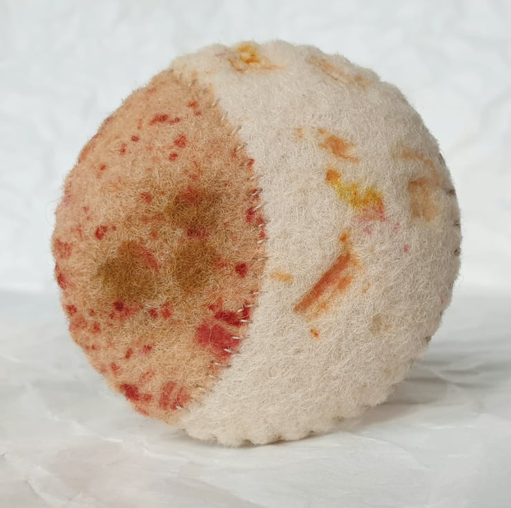 Each moon I make is unique in its patterning and, due to my process of natural dyeing, cannot be replicated. This makes each one as individual as the person who holds it.