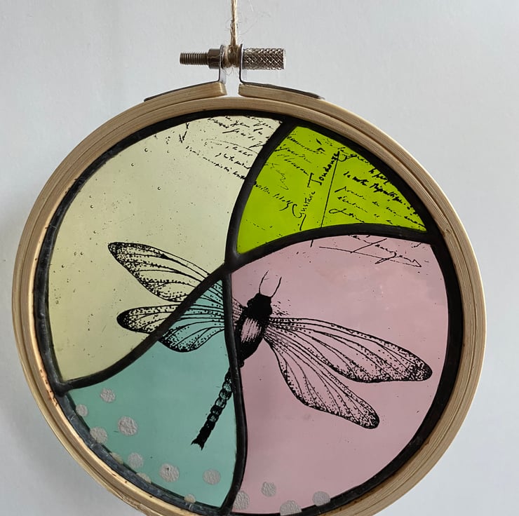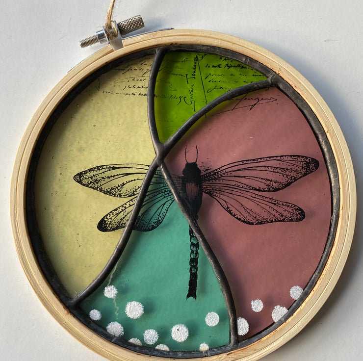 A beautiful stained glass filled embroidery hoop made using the Tiffany ( copper foiled ) method of stained glass . There are 4 pieces of glass in muted tones of green, yellow, aquamarine and purple. It has a screen printed dragonfly and text in black enamel which has been fired in the kiln . The glass has been soldered into an embroidery hoop and it hangs with a hessian string .-