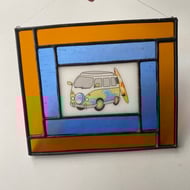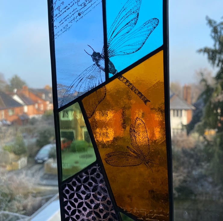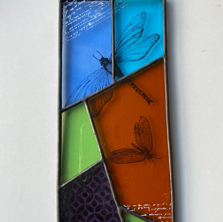 A beautiful 6-piece panel made using the Tiffany (copper foiled) method of stained glass. The panel is comprised of 6 angled pieces of glass in shades of blue, turquoise , purple, amber and green, of varying textures. It has a dragonfly, pattern and text screen printed in black and white enamel and then fired in the kiln. The lead came edge has been patinated to give a black antique finish, and it has a clear nylon hanging thread.