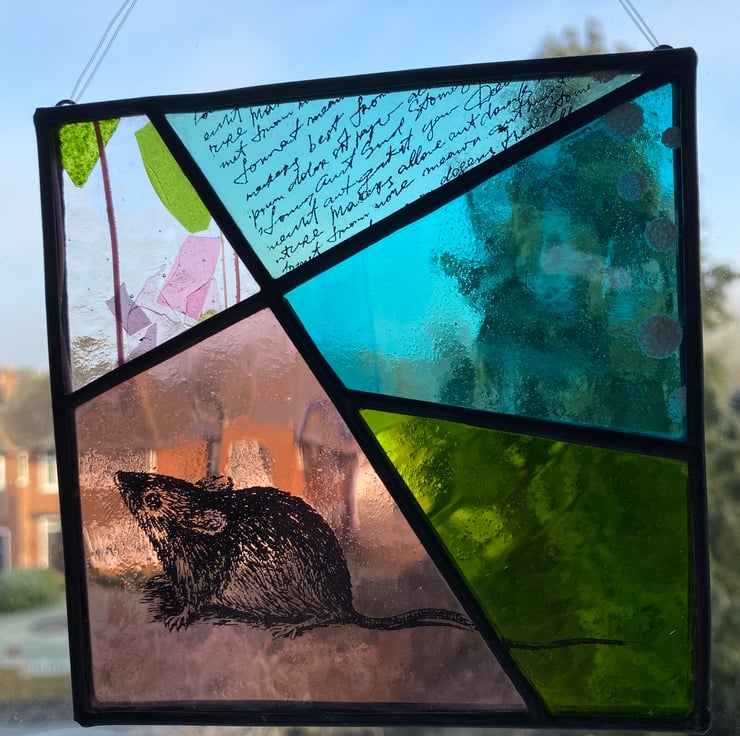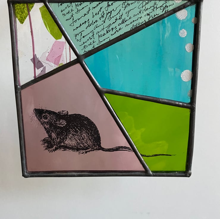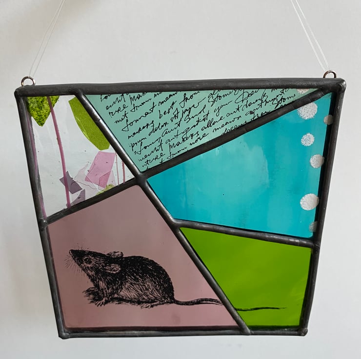 A beautiful 5 piece panel made using the Tiffany (copper foiled) method of stained glass. The panel is comprised of 5 angled pieces of glass in shades of aquamarine, purple, green, teal and pink/ green flake glass. It has a mouse, text and circles screen printed in black and white enamel before firing in the kiln. The lead came edge has been patinated to give a black antique finish, and it has a clear nylon hanging thread.