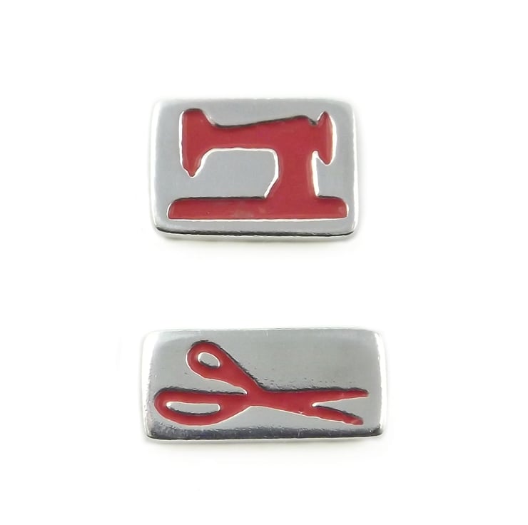 These stud earrings feature images of a sewing machine and a pair of scissors and have been lovingly crafted by hand in the UK. They are made from sterling silver sheet and are etched before being cut by hand, the edges are then smoothed using files and emery paper before the 11mm ear pins are then soldered onto the back. A coloured resin based enamel is added to the etched areas and then the earrings are polished.