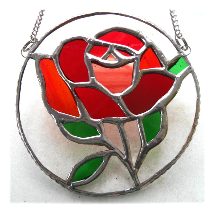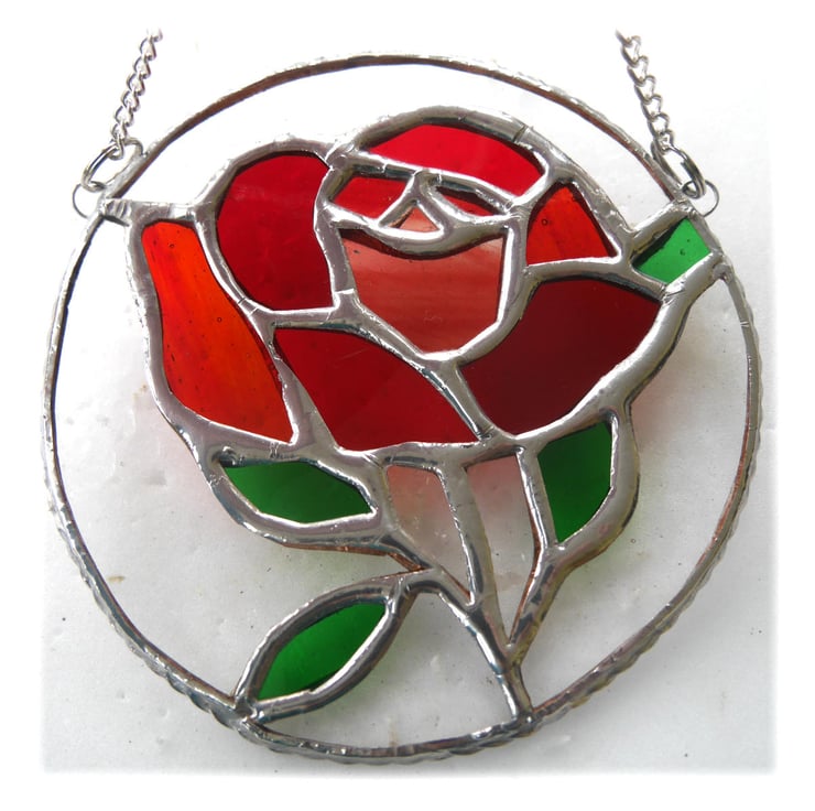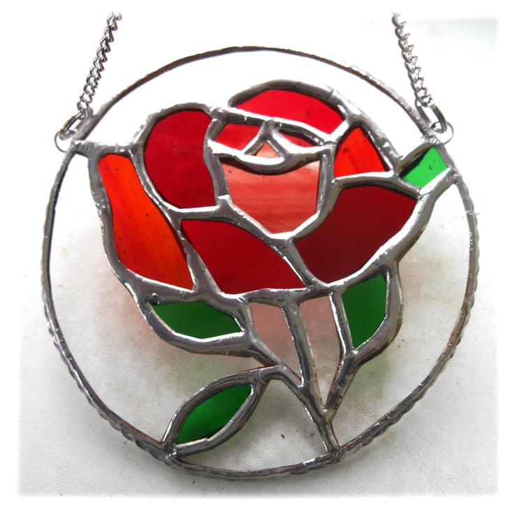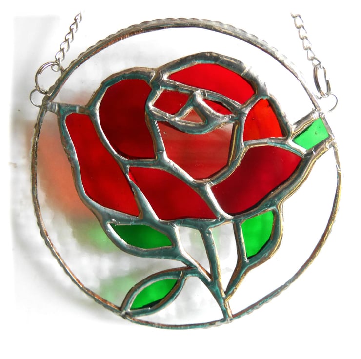 It is a simple full flowered rose made using several different shades and textures of red glass.