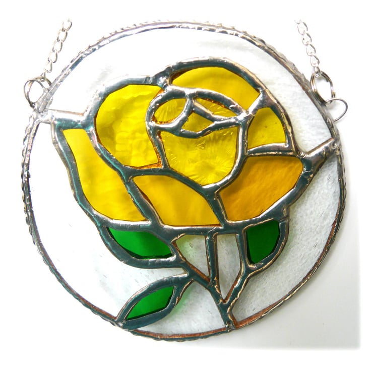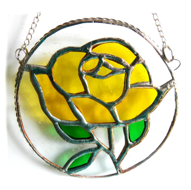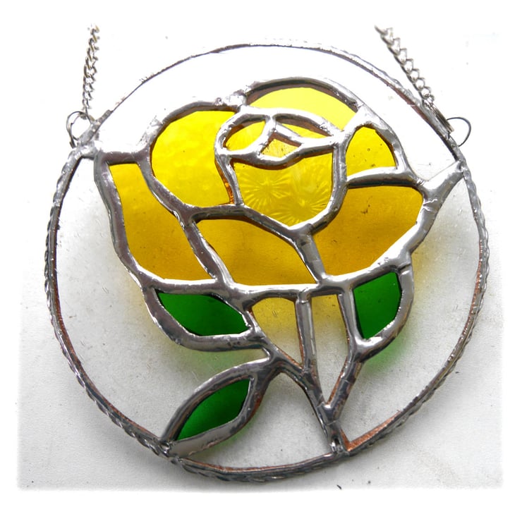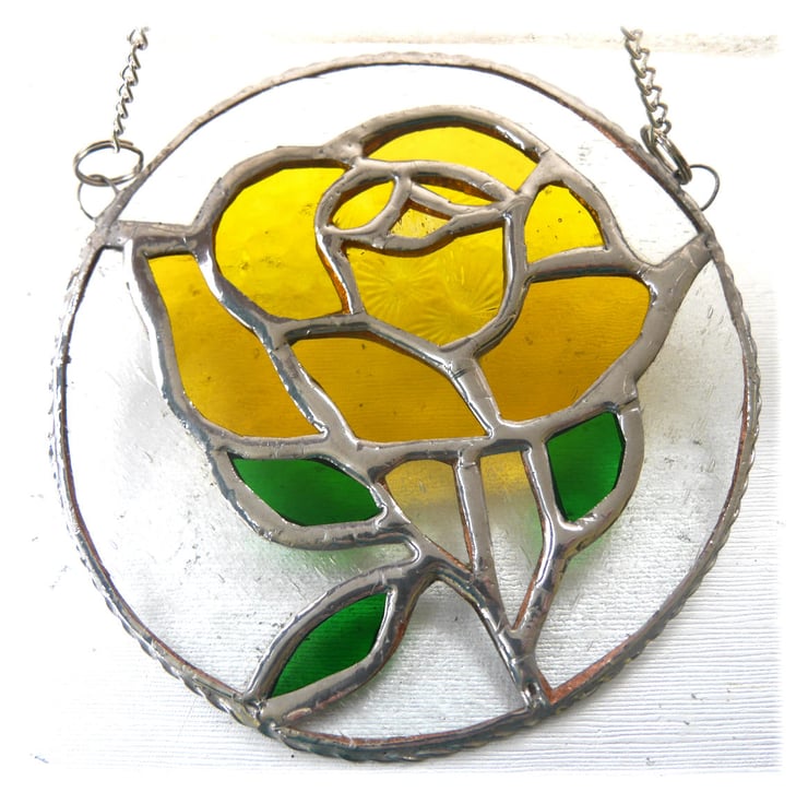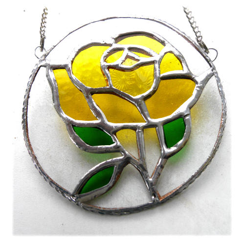 It is a simple full flowered rose made using several different shades and textures of yellow glass.