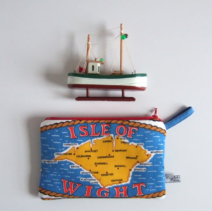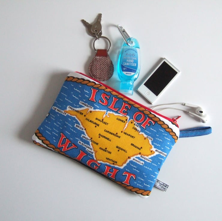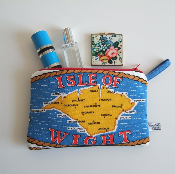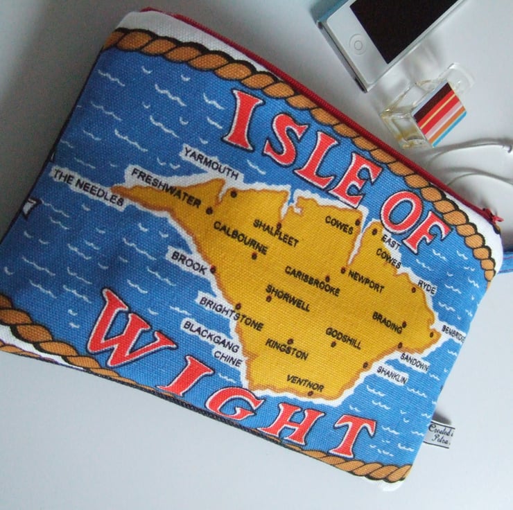 This bright and breezy little bag is made from a section of a vintage teatowel, featuring a map of the lovely Isle of Wight. The Island is in bold yellow, featuring the famous areas of Ryde, Cowes and The Needles all nestling beside the bright blue sea. This practical little bag could be used for make up and headphones, as a floating pocket inside a tote bag, or as a little souvenir storage pouch. It would make a lovely present for a sailor, a traveller, or someone yearning for home right now.