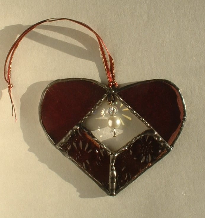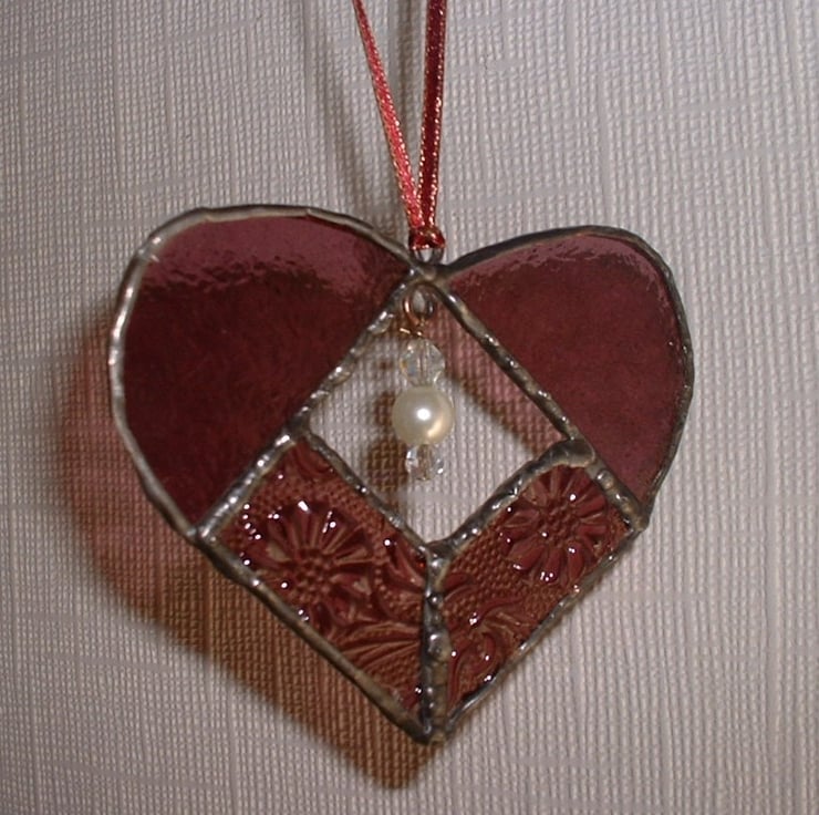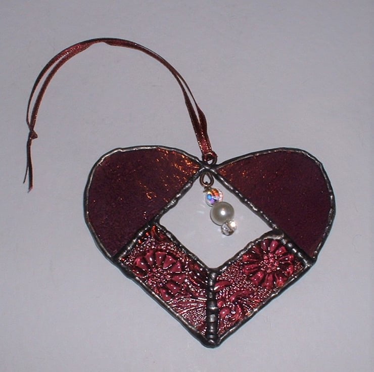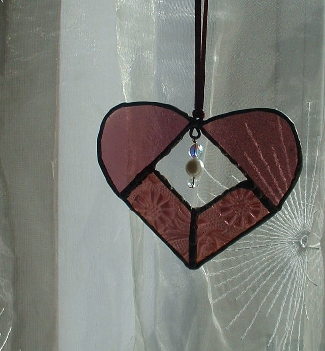 A purple pink heart made from vintage textured and decorative floral glass with a bead dangle
