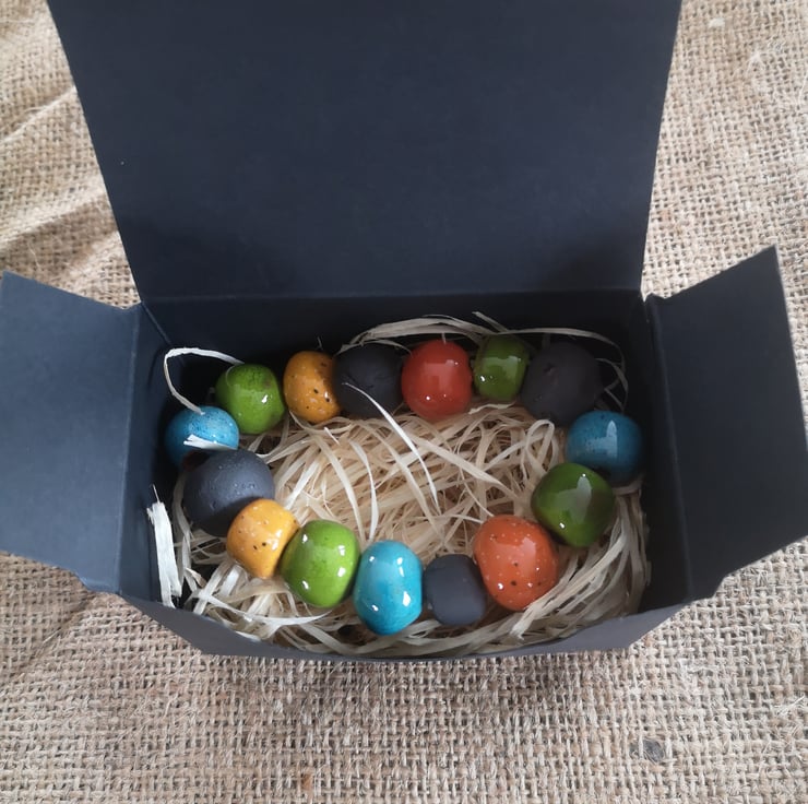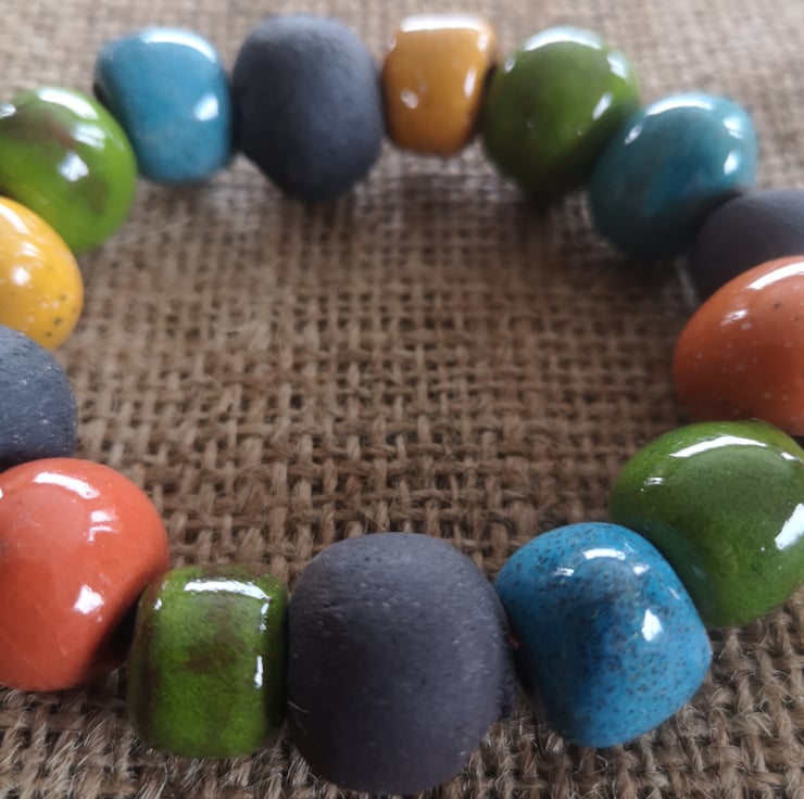 My Pottery bracelets are a really simple, understated way to brighten up any outfit...I made one for myself initially..then had lots of compliments whilst wearing it at Craft Fairs..Its great fun putting the colours together and I can really go to town experimenting with glazes for beads as they are small. Often I will create a colour that I love and then use in a much bigger piece such as a bowl.