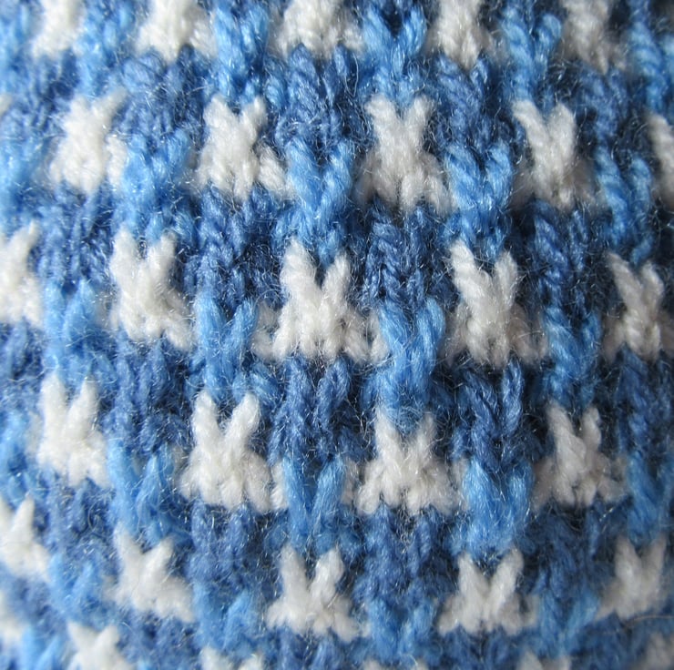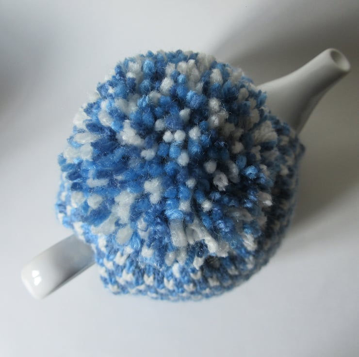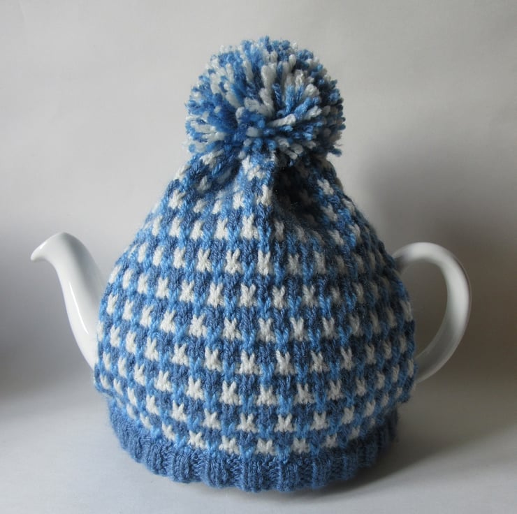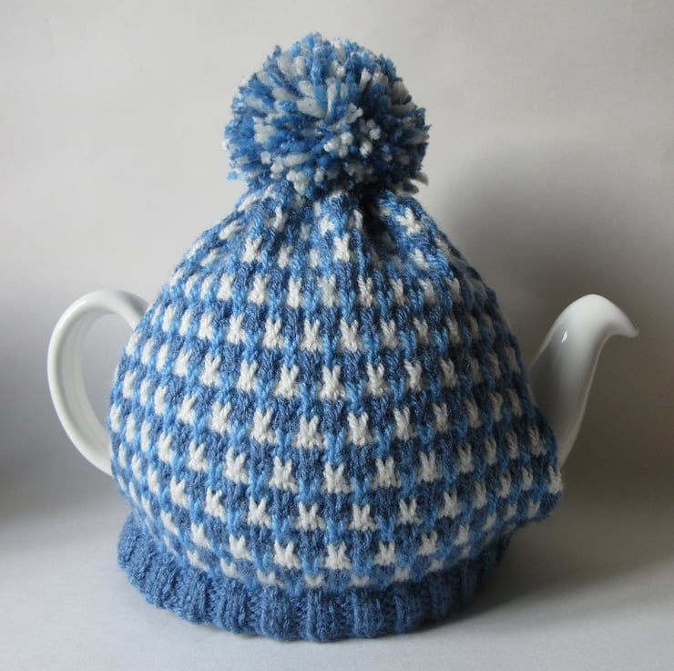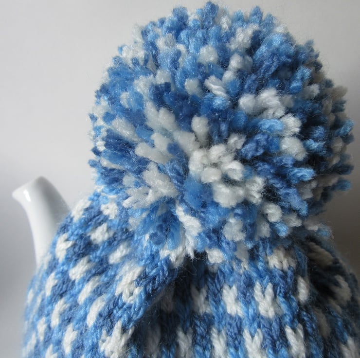 A hand knitted tweed stitch tea pot cosie using classic cornish blue colours, with an oversized pompom atop. Starting at the hem I have knitted the rib in a denim blue coloured yarn. Then using three different coloured yarns; bright cornish blue, denim blue, and cream, I have knitted a wonderful tweed stitch tea cosie body. Adding an oversized pompom, nestled on the top, in the same three colour. This stitch ensures a good fit around the pot, yet has enough ease for a swift removal when a 'top - up' is required. The tea pot handle peeps through the side opening so it dosnt get too hot to handle. A perfect house warming gift, or for yourself...... just because it looks pretty on the kitchen work top.