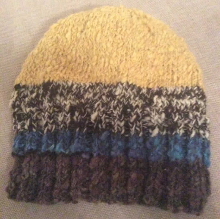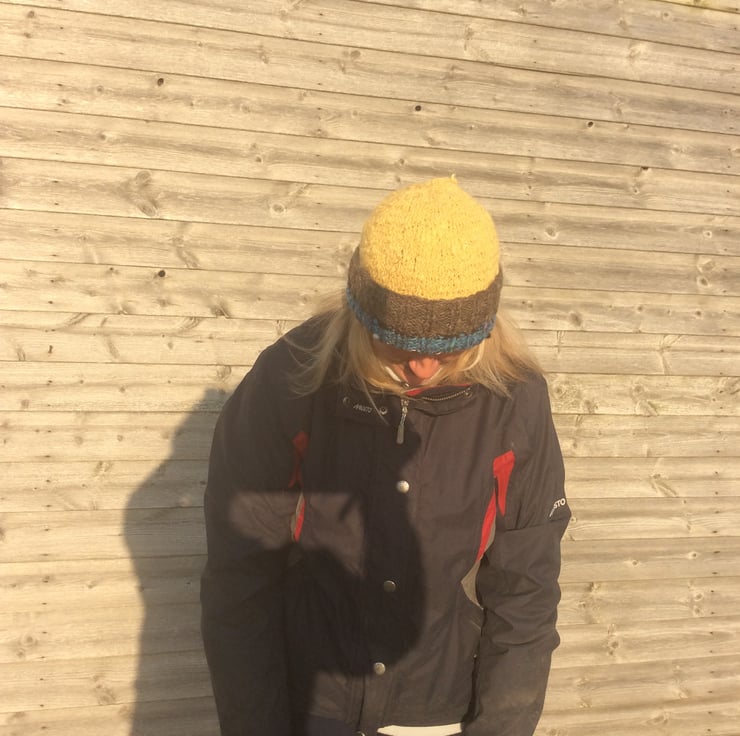 Colour block and rustic beanie made from the fleece of several sheep breeds making the item both multicoloured and multi textured. All wool hand spun and item hand knitted. The crown is a sandy yellow colour graduating to a block of brown and white which is natural zwartbles wool plied with a mixed breed white fleece which continues into the ribbed brim. A blue seascape block followed by a dark green colour complete the brim.