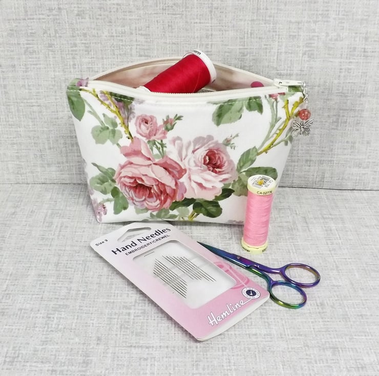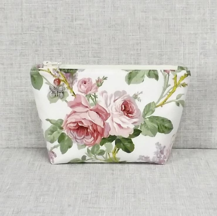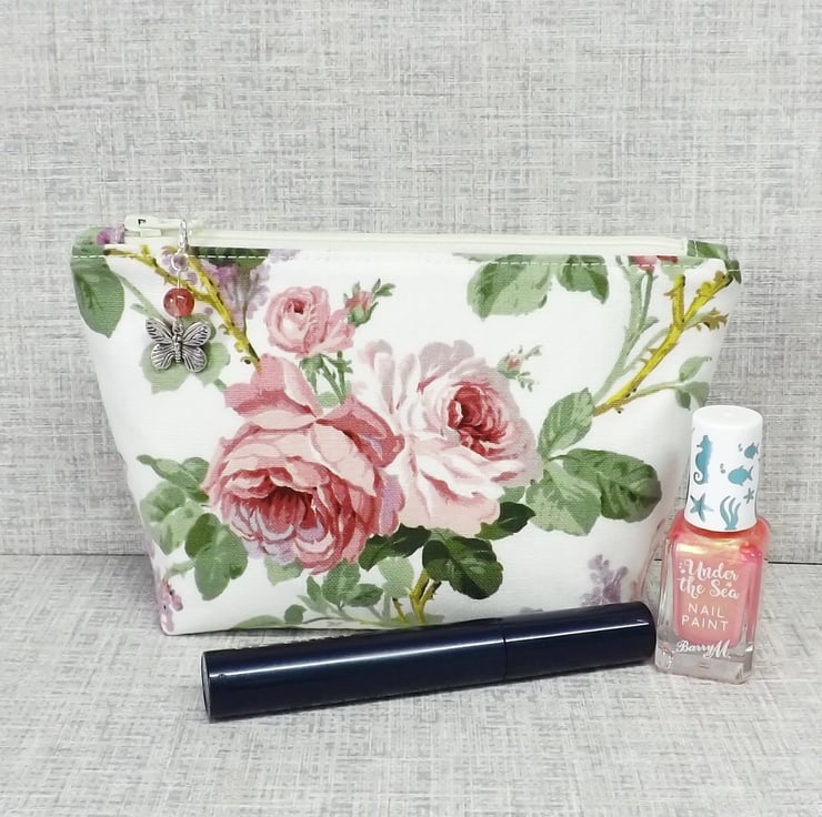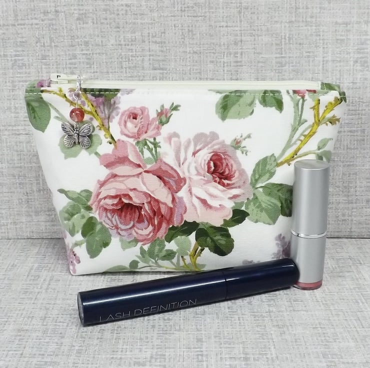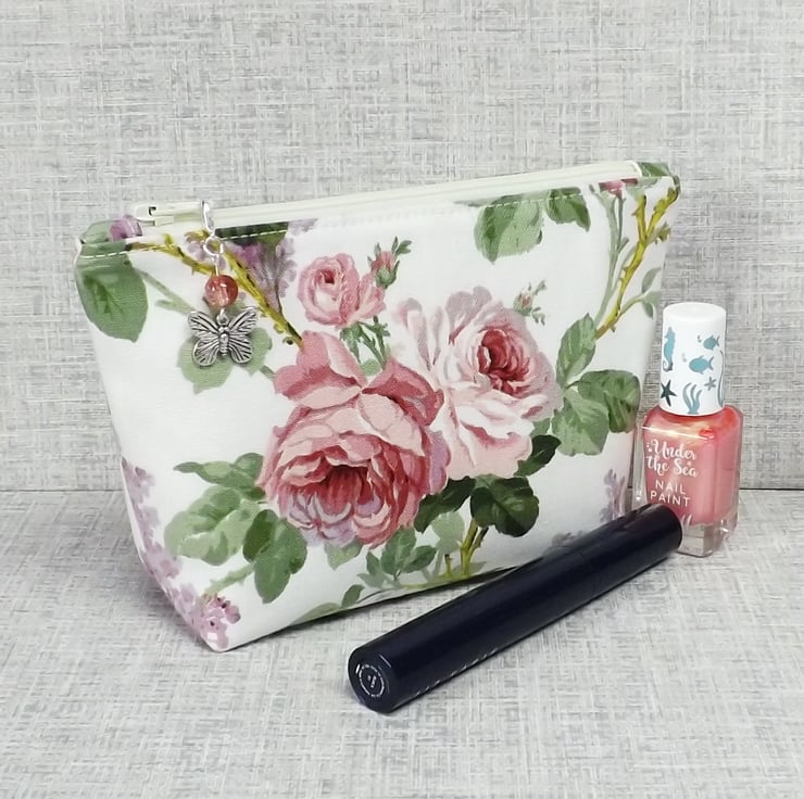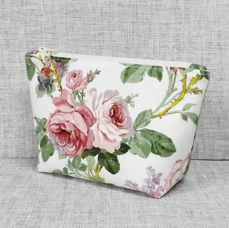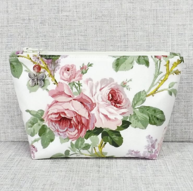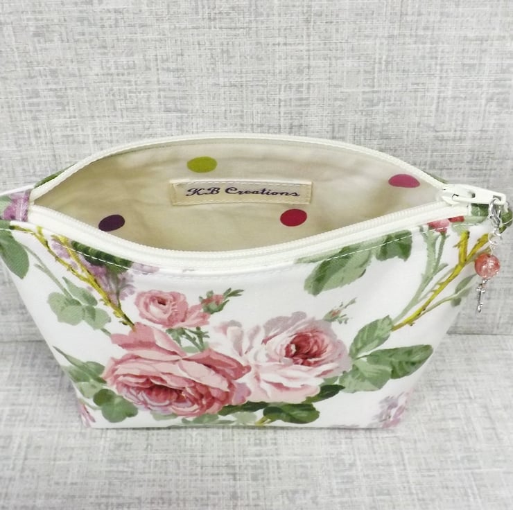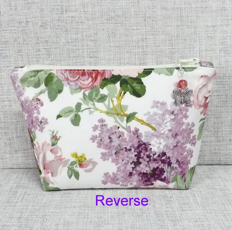 A medium sized make up bag/zipped pouch made from a 'Sanderson' fabric with pink roses and lilacs on an off white background. The lining is an off white with spots in pink, lilac, purple and green.