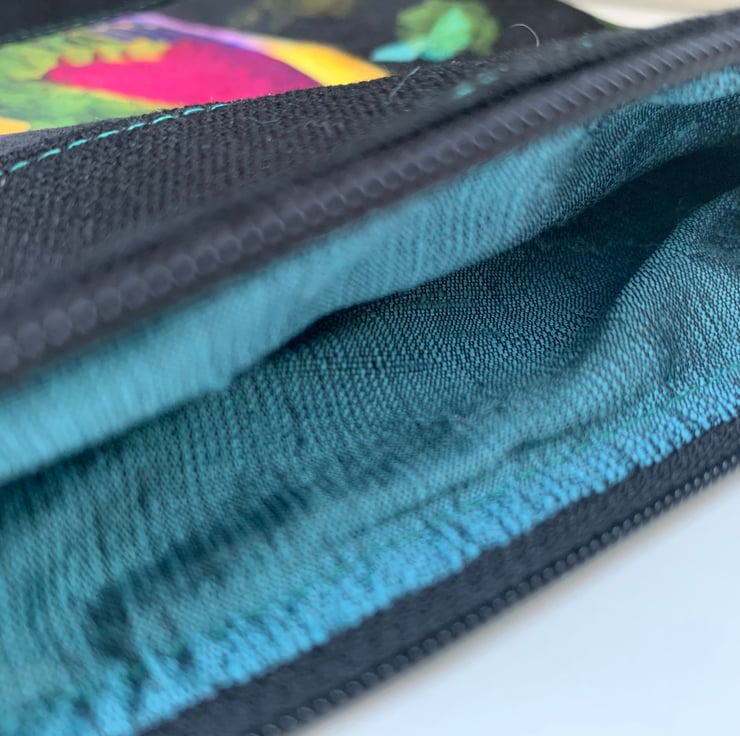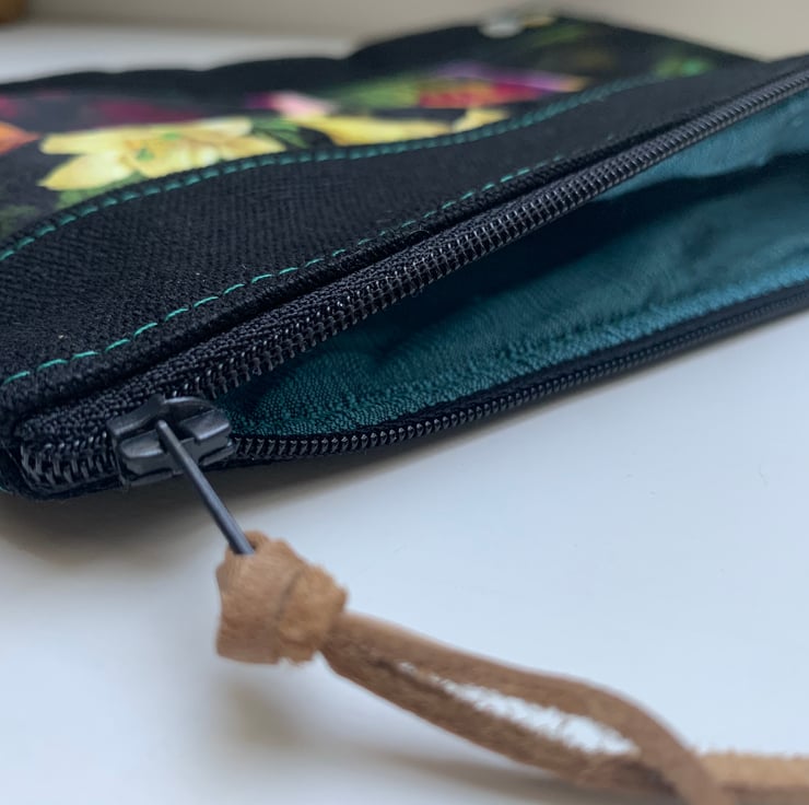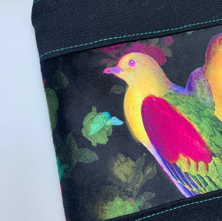 Beautiful one of a kind zip pouch with a colourful velvet panel of exotic birds.