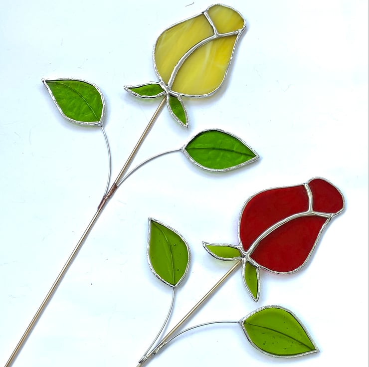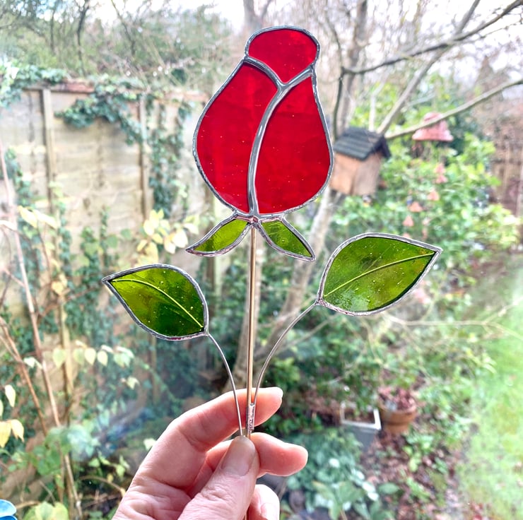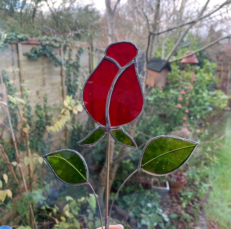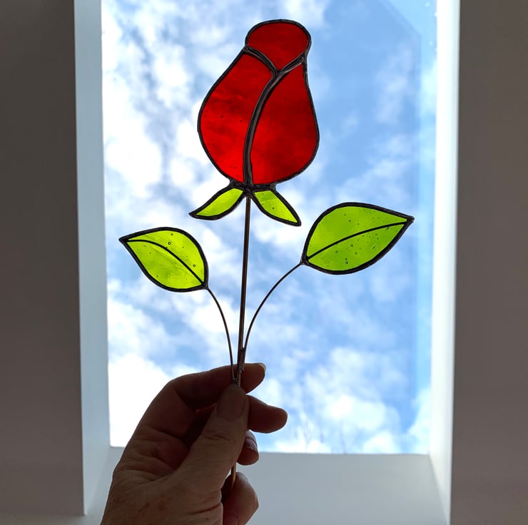 Each piece of glass has been hand cut, ground, foiled and soldered together, a copper coloured rod has been attached which measures approx 30 cms, this can be cut if you would like it shorter. The leaves on the stem have been attached to tinned copper wire and make them look like a real rose.