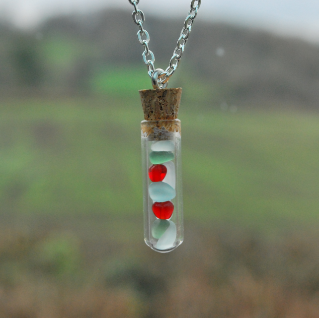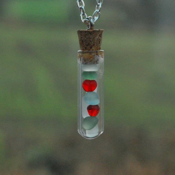 Only the very smallest chips of sea glass we find can fit in this charming tiny bottle. We have added two tiny red glass heart beads to make the pendant extra special. The glass chips are white and shades of aquamarine, and we have tumbled them until they are smooth.