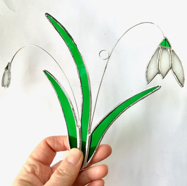 The suncatcher has been made out of green textured glass and white streaky glass for the petals, the flower and bud hang from a wire stalk. Each piece is hand cut, ground, washed, foiled and then soldered together before being washed again, A ring has been attached for hanging purposes.