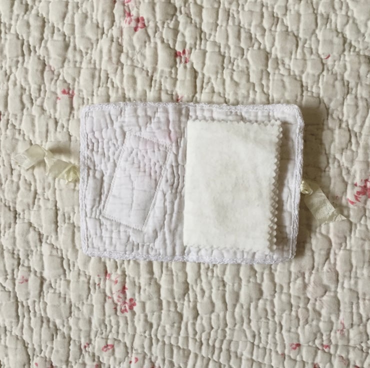 The main fabric is a piece of antique hand quilted Durham quilt. Edges are bound with vintage cotton lace. Decorated with a rose printed, vintage Wills cigarette card. The needle case fastens with cream crinkle ribbon ties. Contains 4 pages of soft cotton Wincyette fabric to store your pins and/or needles.