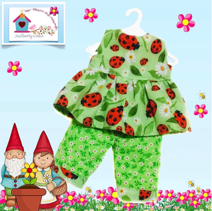 A really cute little set to fit the Mulberry Green characters. The outfit consists of a sweet little blouse with a peplum hem and a pair of matching trousers in polycotton. It comes on a cute little wooden hanger.