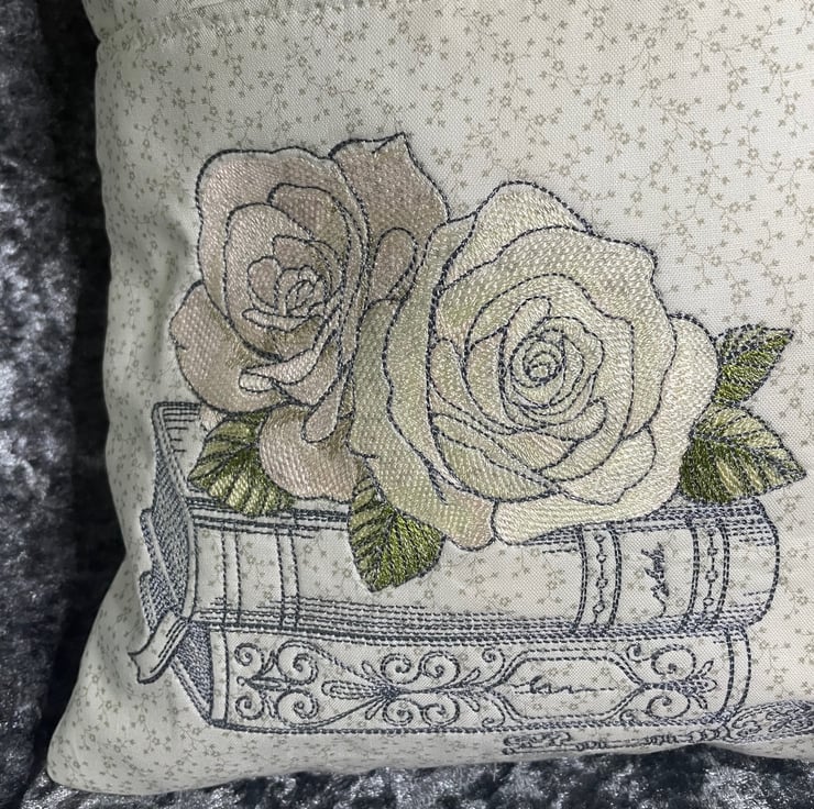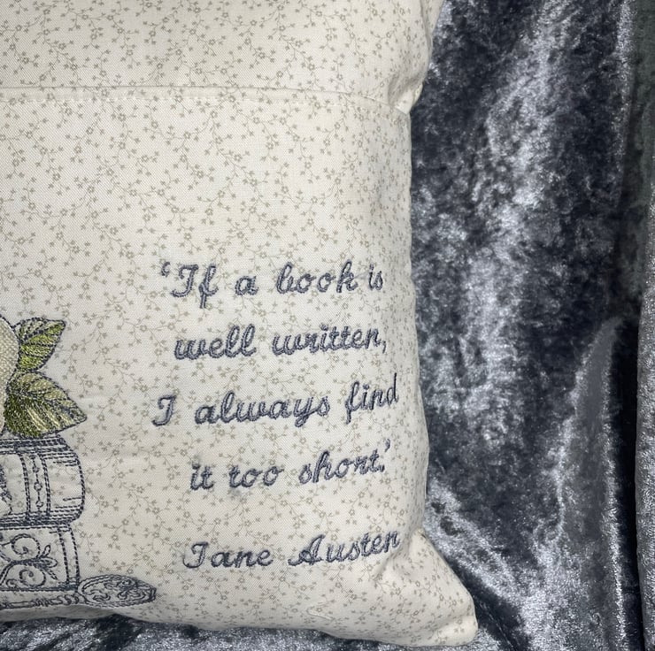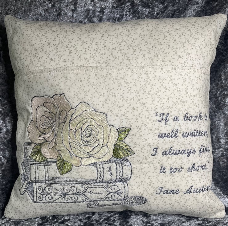 For all Jane Austen lovers a pretty pillow with a pocket, machine embroidered design of pink and cream roses on a pile of books in the sketch style. Quote 'If a book is well written, I always find it too short.' Jane Austen.
