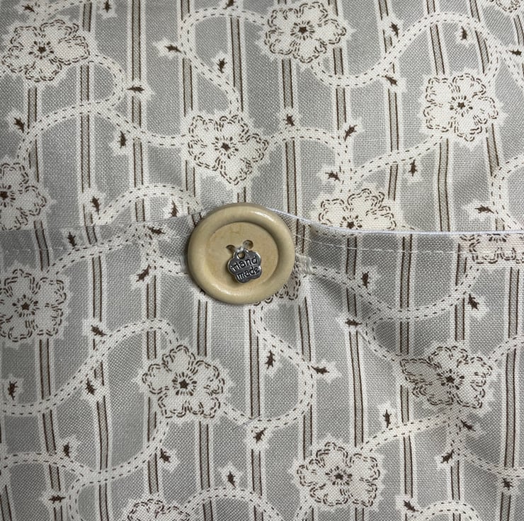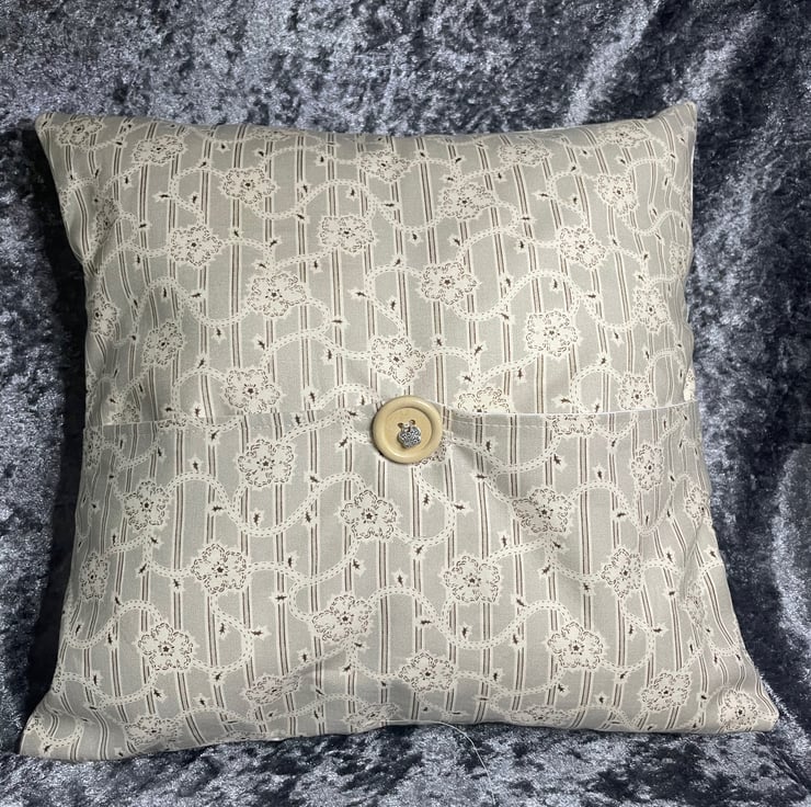 The front of the cushion is made in a cream and taupe sprig pattern, the back in a cream and taupe patterned design. With a button and charm for closure. fully lined with no raw edges showing.