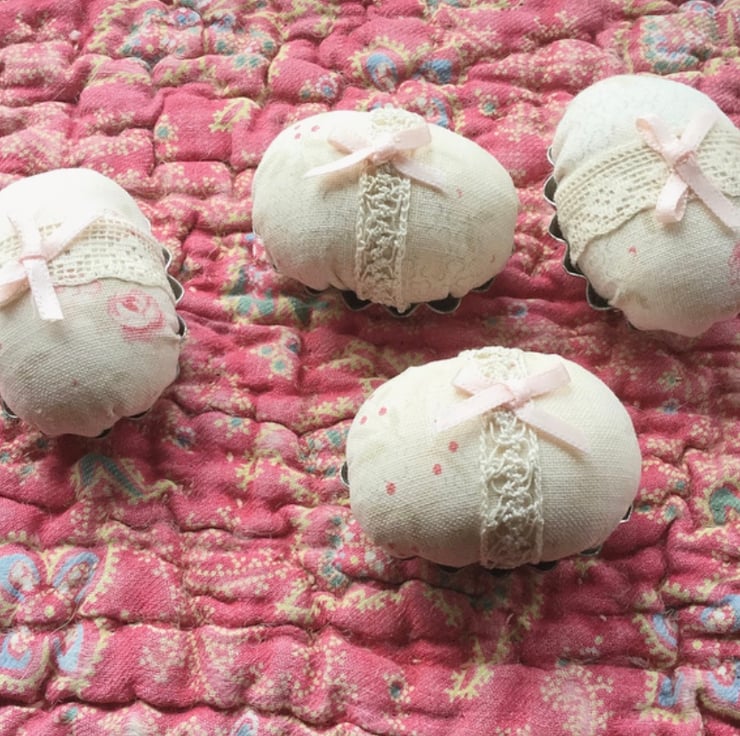 Vintage pin cushion, set in a vintage mini patisserie tin.