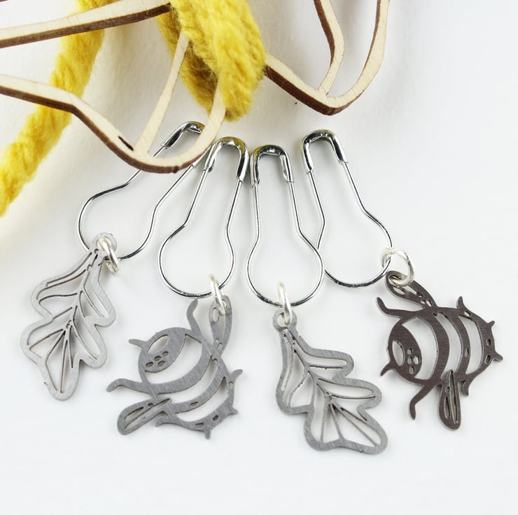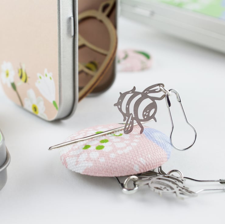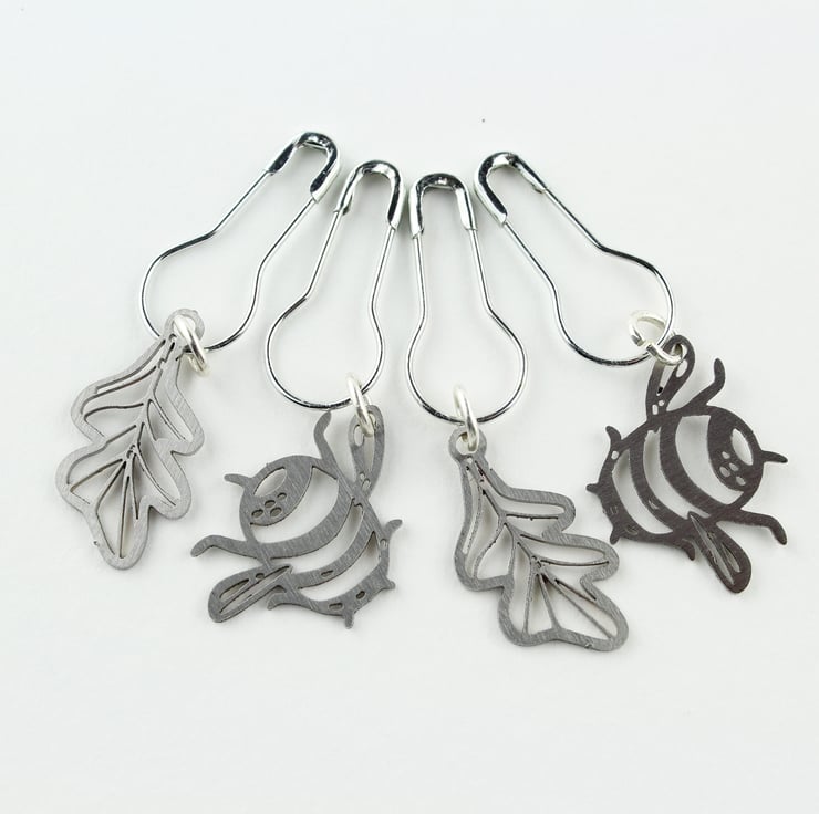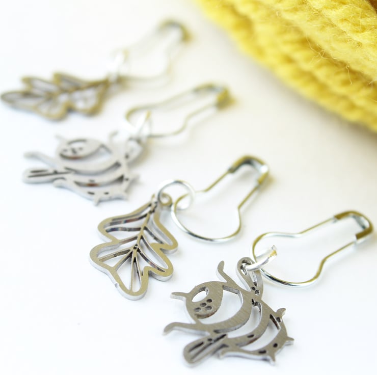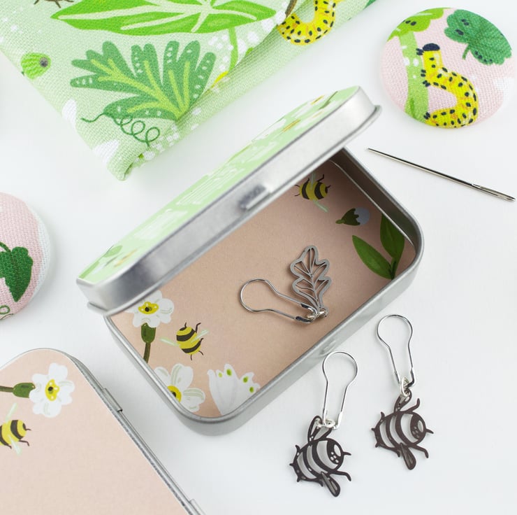 Pack of 4 crafted stainless steel stitch markers (progress keepers), two bees, and 2 leaves, in a keepsake tin. We’re always looking to make lovely things from our illustrations that are useful and make great gifts, especially for the sewing and crafting community. We’re supper proud of these NEW thread markers. They are made from stainless steel so they won’t tarnish, and hang on a bulb shaped pin making them very easy to slip onto your needle, and they're tough enough to not bend and break. They come in a beautiful keepsake tin which makes them a very thoughtful gift. The pack contains 2 intricate bees and 2 oak leaves. We think they’d make amazing and unusual gifts for anyone who knits or crochets. We've also used our leaves and bees on other crafting items, see other listings.