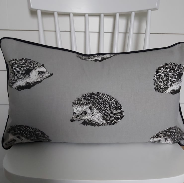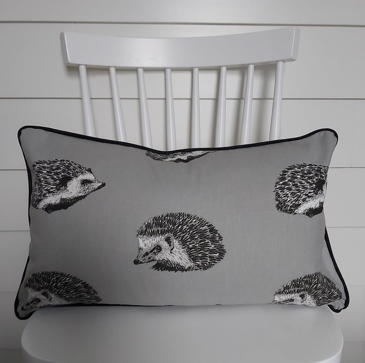 Hedgehog fabric cushion with cream back and central zip and black piping