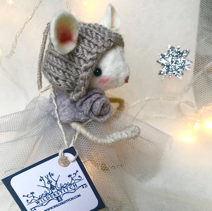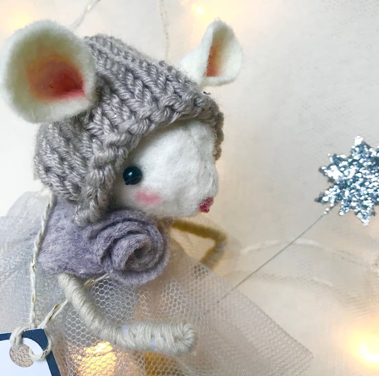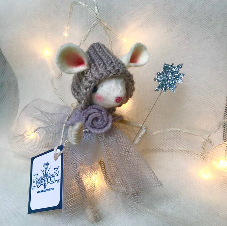 Ella is 11cm tall and wears a mauve hand knitted bonnet and a light grey tulle tutu embellished with a rose. She carries a magic star wand to wave away your winter blues!