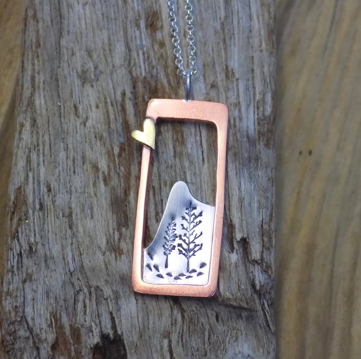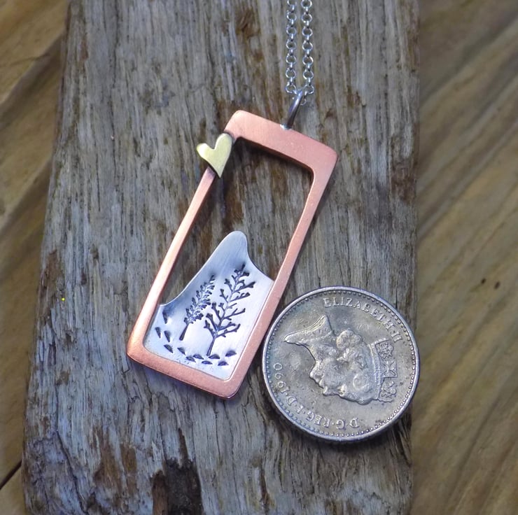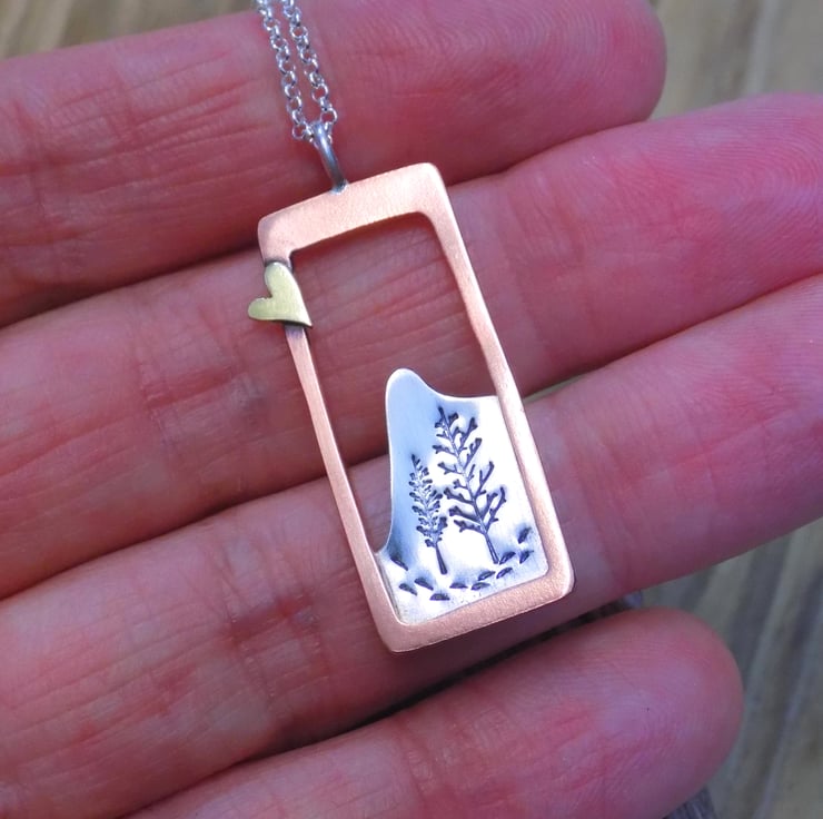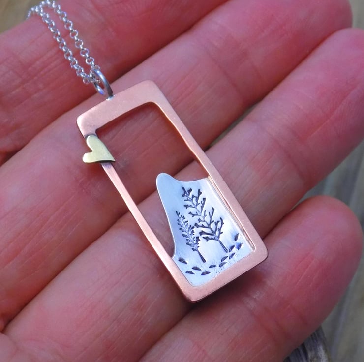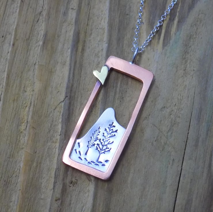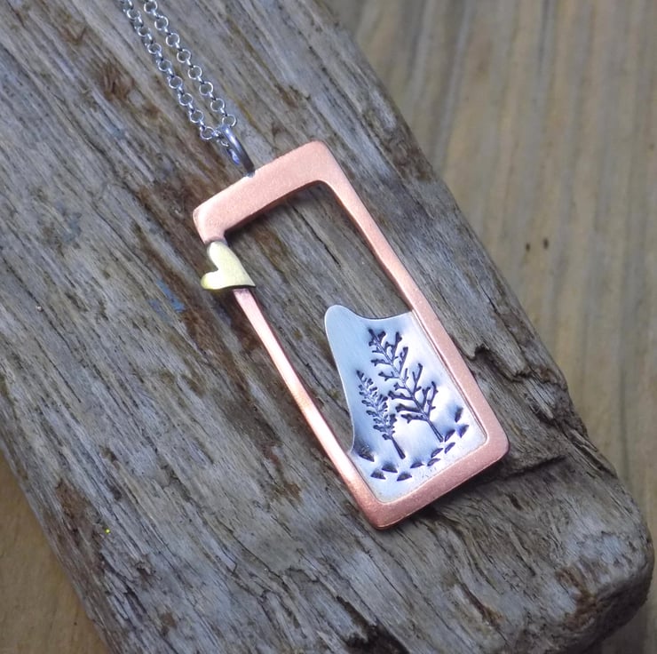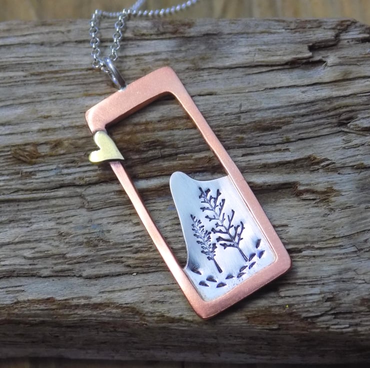 The frame has been sawn out from thick copper sheet ,filed and sanded smooth. The silver sheet has been soldered onto the frame and contains a little scene of winter trees and tiny footsteps through the snow. Lastly a tiny brass love heart has been soldered to the edge of the frame to make it extra special ! Suspended from a sterling silver 18 " belcher chain.