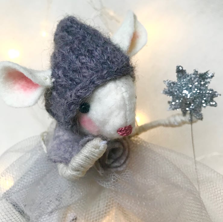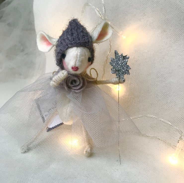 Josephine is 11cm tall and wears a dusty purple hand knitted bonnet. Her dress is soft, grey tulle and she keeps her mousey shoulders warm with a lavender wool felt capelette fastened with a rose. She carries a sparkling star wand to wave away your winter blues. She will arrive in an embossed gift box.