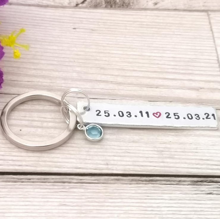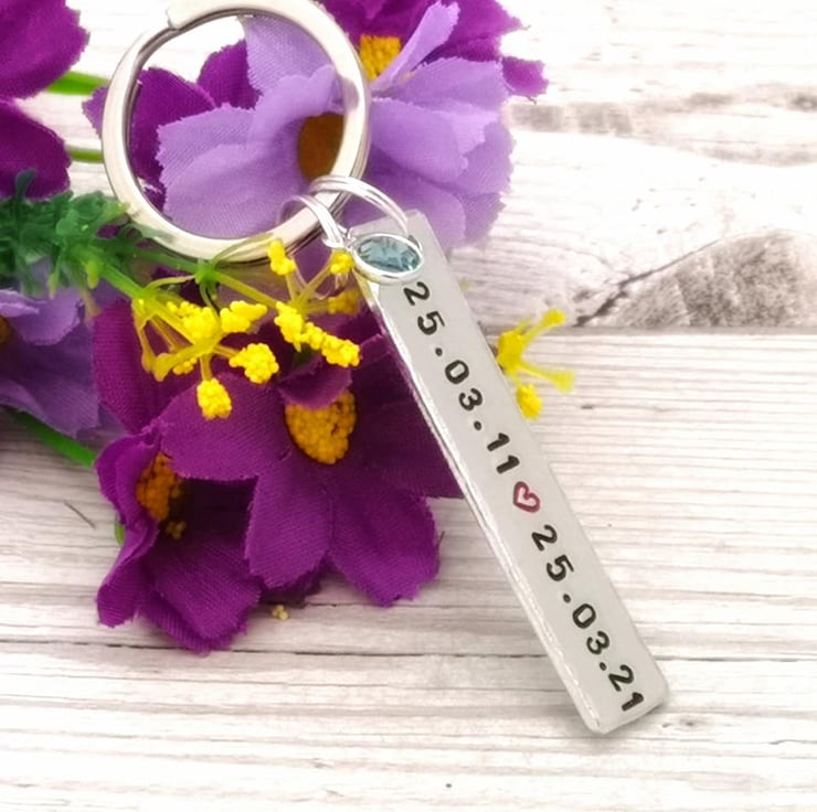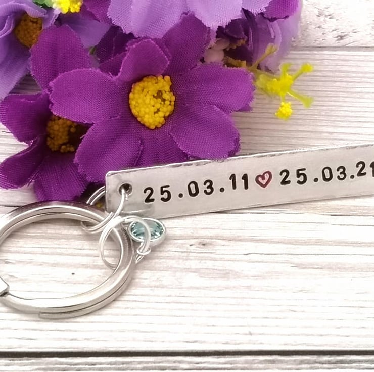 This sentimental keyring with a colourful crystal can display two dates alongside each other, separated by a red heart.