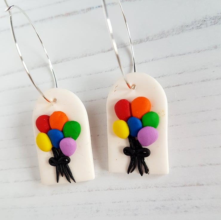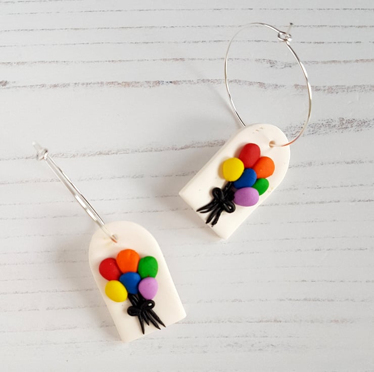 These beautiful bright rainbow colour balloon earrings have been carefully hand crafted using polymer clay, with tiny individual balloons placed onto a white backing piece of clay, and black strings added, then finally cut to shape.