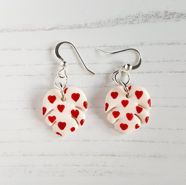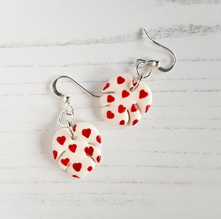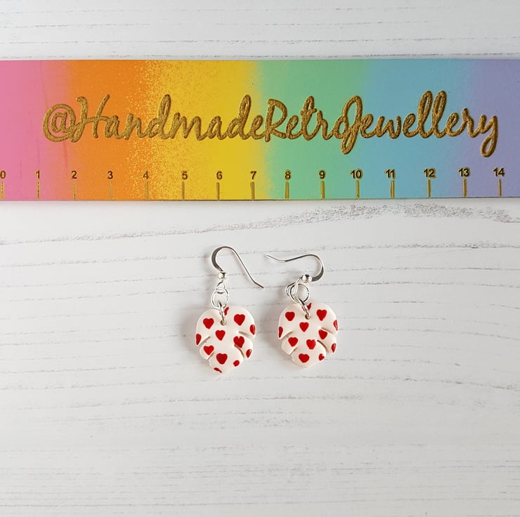 These gorgeous white coloured tropical leaf earrings have been carefully hand crafted using polymer clay, with tiny hand painted red hearts all over! Finished off with a gloss to seal.