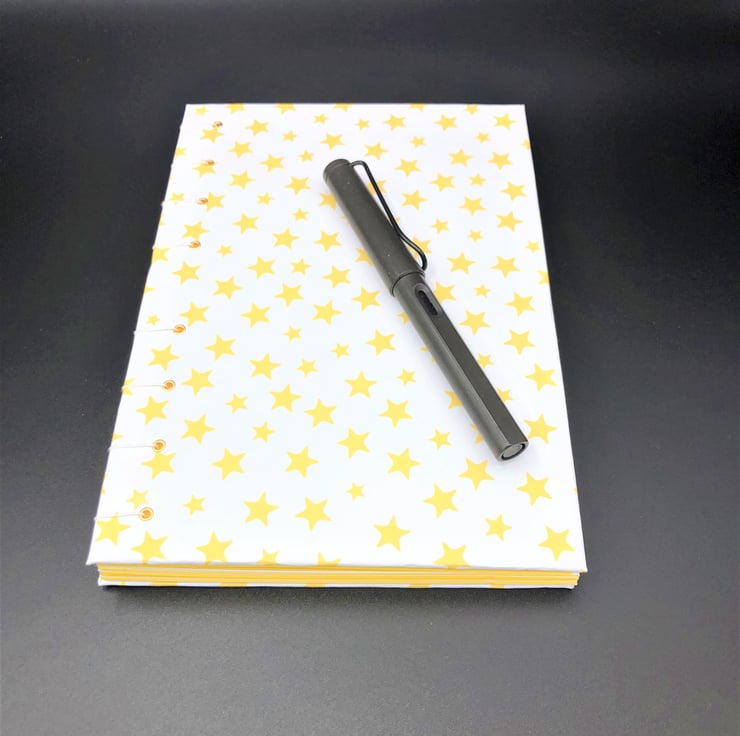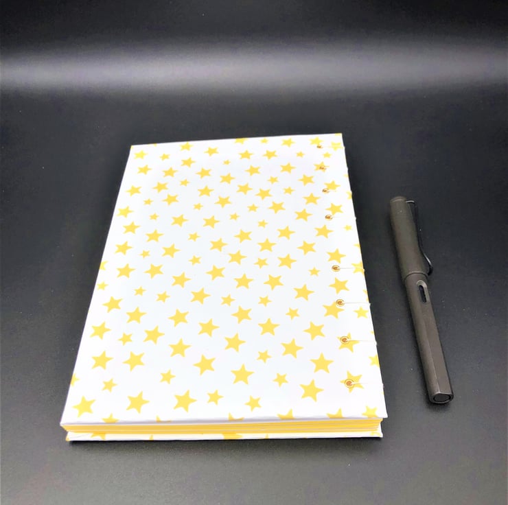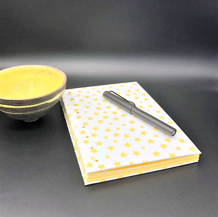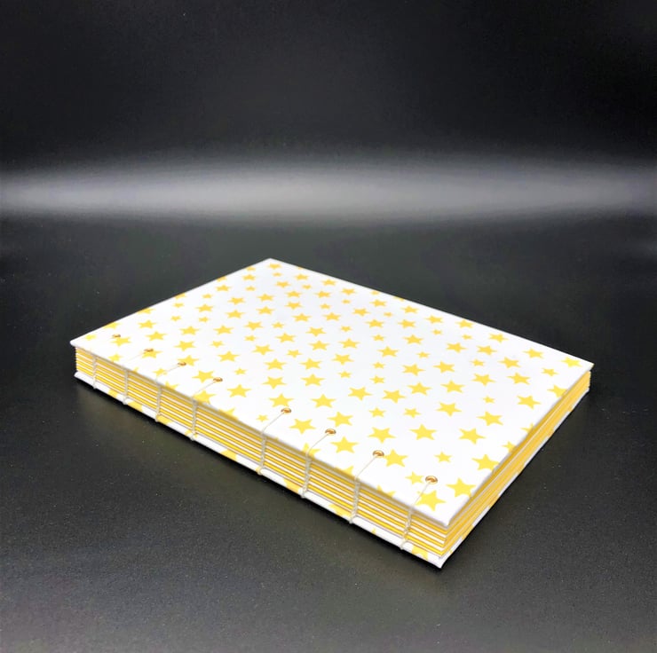 Bright and sunny to lighten these dark days of winter! An A5 coptic stitched notebook with white covers strewn with golden stars. Gold eyelets and white waxed linen thread. The pages alternate between signatures of golden yellow and white to match the covers.