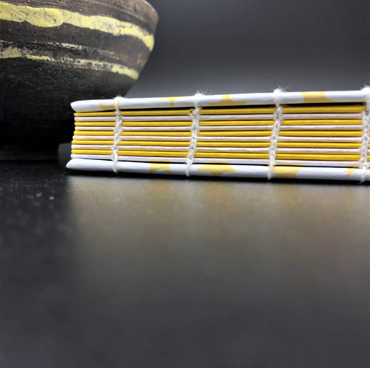 Traditionally hand bound with 10 signatures (80 pages, or 160 sides) in white and yellow 80gsm paper and matching yellow end papers.